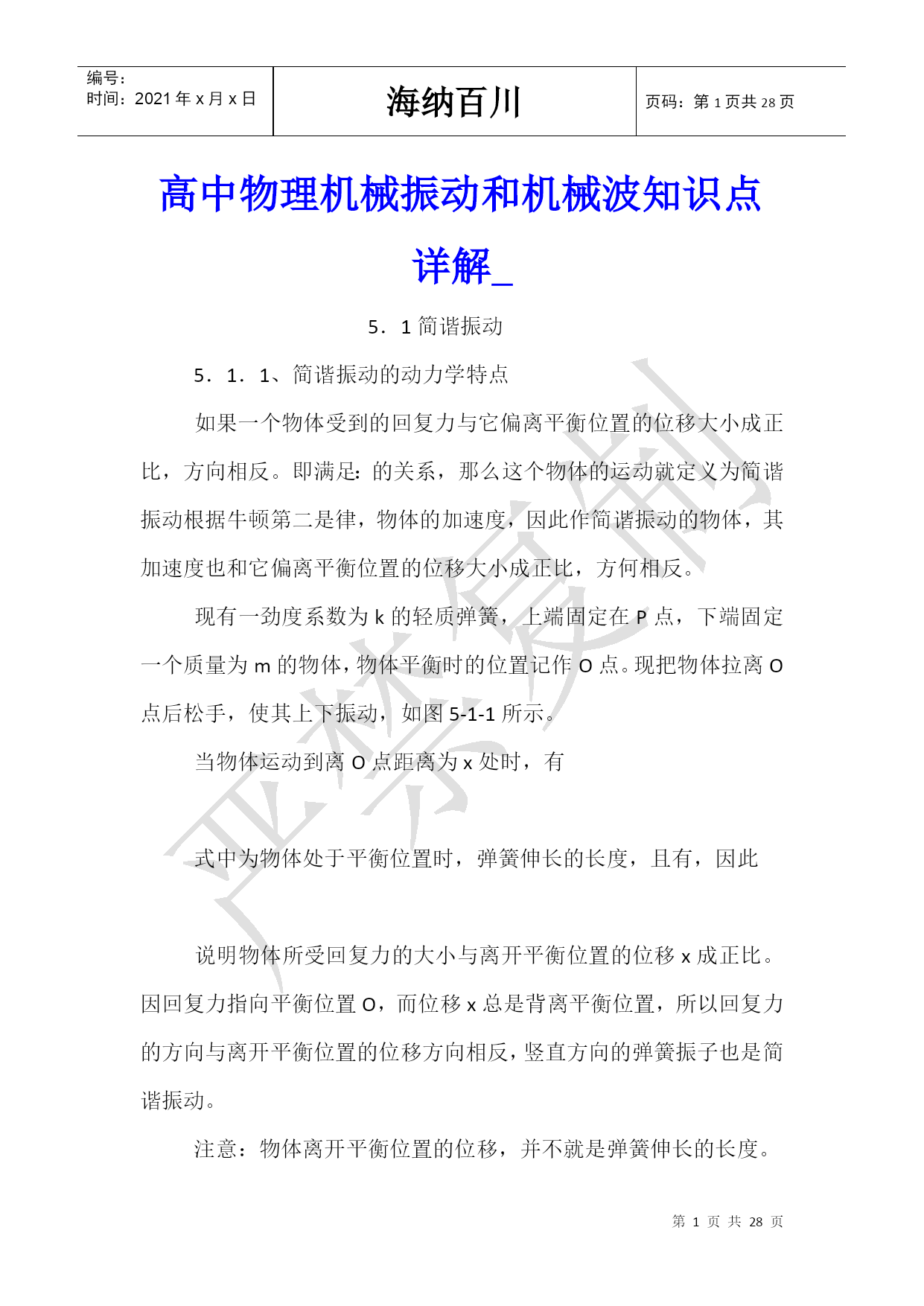 编号:时间:2021年x月x日海纳百川页码:第PAGE28页共NUMPAGES28页第PAGE\*MERGEFORMAT28页共NUMPAGES\*MERGEFORMAT28页高中物理机械振动和机械波知识点详解_5.1简谐振动5.1.1、简谐振动的动力学特点如果一个物体受到的回复力与它偏离平衡位置的位移大小成正比,方向相反。即满足:的关系,那么这个物体的运动就定义为简谐振动根据牛顿第二是律,物体的加速度,因此作简谐振动的物体,其加速度也和它偏离平衡位置的位移大小成正比,方何相反。现