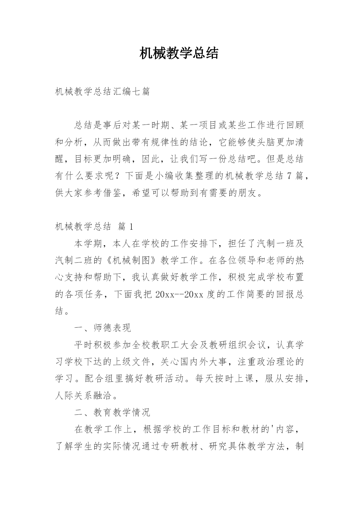 机械教学总结机械教学总结汇编七篇总结是事后对某一时期、某一项目或某些工作进行回顾和分析,从而做出带有规律性的结论,它能够使头脑更加清醒,目标更加明确,因此,让我们写一份总结吧。但是总结有什么要求呢?下面是小编收集整理的机械教学总结7篇,供大家参考借鉴,希望可以帮助到有需要的朋友。机械教学总结篇1本学期,本人在学校的工作安排下,担任了汽制一班及汽制二班的《机械制图》教学工作。在各位领导和老师的热心支持和帮助下,我认真做好教学工作,积极完成学校布置的各项任务,下面我把20xx--20xx度的工作简要的回报总结