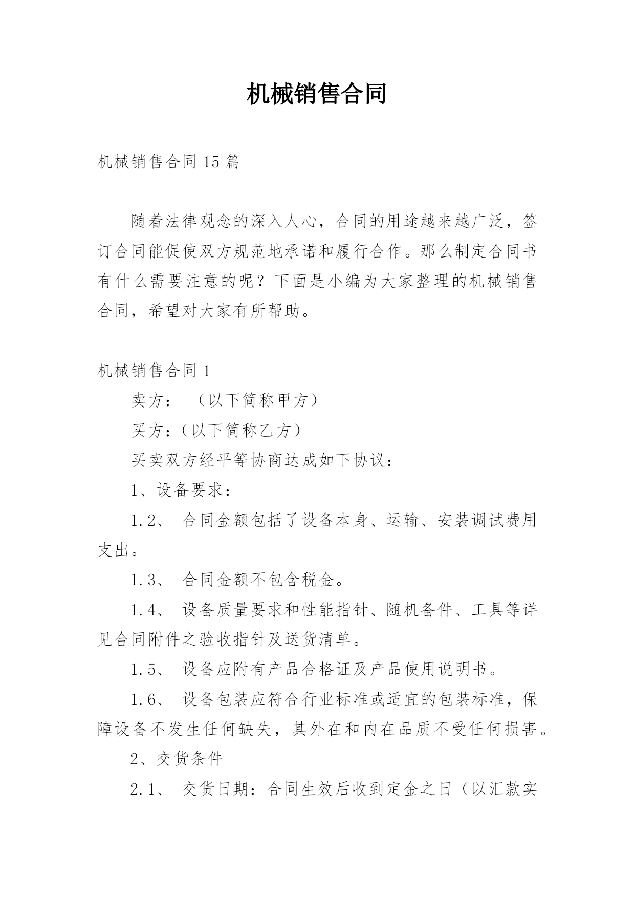 机械销售合同机械销售合同15篇随着法律观念的深入人心,合同的用途越来越广泛,签订合同能促使双方规范地承诺和履行合作。那么制定合同书有什么需要注意的呢?下面是小编为大家整理的机械销售合同,希望对大家有所帮助。机械销售合同1卖方:(以下简称甲方)买方:(以下简称乙方)买卖双方经平等协商达成如下协议:1、设备要求:1.2、合同金额包括了设备本身、运输、安装调试费用支出。1.3、合同金额不包含税金。1.4、设备质量要求和性能指针、随机备件、工具等详见合同附件之验收指针及送货清单。1.5、设备应附有产品合格证及产品