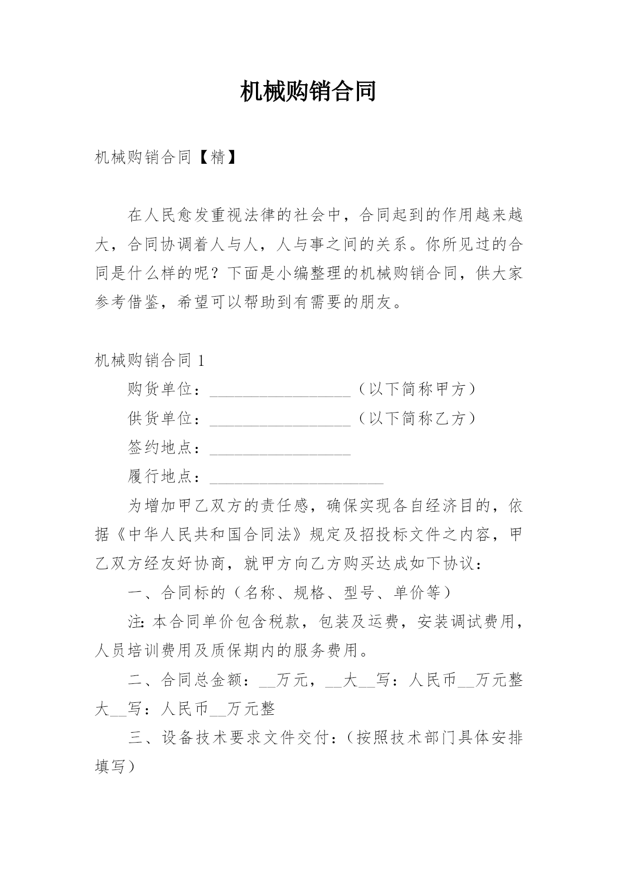 机械购销合同机械购销合同【精】在人民愈发重视法律的社会中,合同起到的作用越来越大,合同协调着人与人,人与事之间的关系。你所见过的合同是什么样的呢?下面是小编整理的机械购销合同,供大家参考借鉴,希望可以帮助到有需要的朋友。机械购销合同1购货单位:_________________(以下简称甲方)供货单位:_________________(以下简称乙方)签约地点:_________________履行地点:_____________________为增加甲乙双方的责任感,确保实现各自经济目的,依据《中华人民