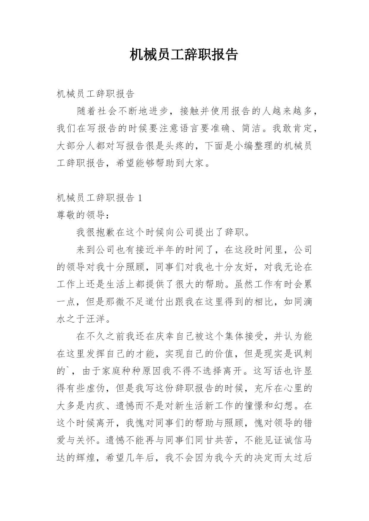 机械员工辞职报告机械员工辞职报告随着社会不断地进步,接触并使用报告的人越来越多,我们在写报告的时候要注意语言要准确、简洁。我敢肯定,大部分人都对写报告很是头疼的,下面是小编整理的机械员工辞职报告,希望能够帮助到大家。机械员工辞职报告1尊敬的领导:我很抱歉在这个时候向公司提出了辞职。来到公司也有接近半年的时间了,在这段时间里,公司的领导对我十分照顾,同事们对我也十分友好,对我无论在工作上还是生活上都提供了很大的帮助。虽然工作有时会累一点,但是那微不足道付出跟我在这里得到的相比,如同滴水之于汪洋。在不久之前我