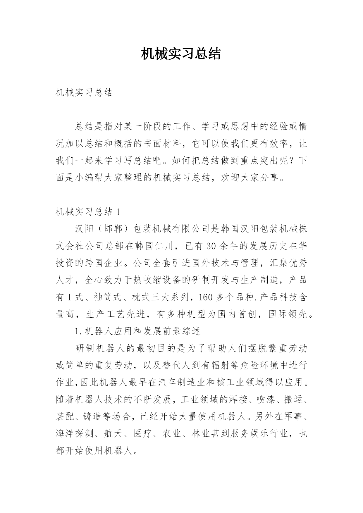 机械实习总结机械实习总结总结是指对某一阶段的工作、学习或思想中的经验或情况加以总结和概括的书面材料,它可以使我们更有效率,让我们一起来学习写总结吧。如何把总结做到重点突出呢?下面是小编帮大家整理的机械实习总结,欢迎大家分享。机械实习总结1汉阳(邯郸)包装机械有限公司是韩国汉阳包装机械株式会社公司总部在韩国仁川,已有30余年的发展历史在华投资的跨国企业。公司全套引进国外技术与管理,汇集优秀人才,全心致力于热收缩设备的研制开发与生产制造,产品有l式、袖筒式、枕式三大系列,160多个品种.产品科技含量高,生产工