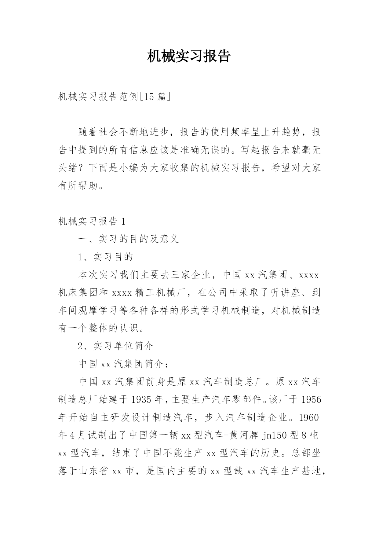 机械实习报告机械实习报告范例[15篇]随着社会不断地进步,报告的使用频率呈上升趋势,报告中提到的所有信息应该是准确无误的。写起报告来就毫无头绪?下面是小编为大家收集的机械实习报告,希望对大家有所帮助。机械实习报告1一、实习的目的及意义1、实习目的本次实习我们主要去三家企业,中国xx汽集团、xxxx机床集团和xxxx精工机械厂,在公司中采取了听讲座、到车间观摩学习等各种各样的形式学习机械制造,对机械制造有一个整体的认识。2、实习单位简介中国xx汽集团简介:中国xx汽集团前身是原xx汽车制造总厂。原xx汽车制