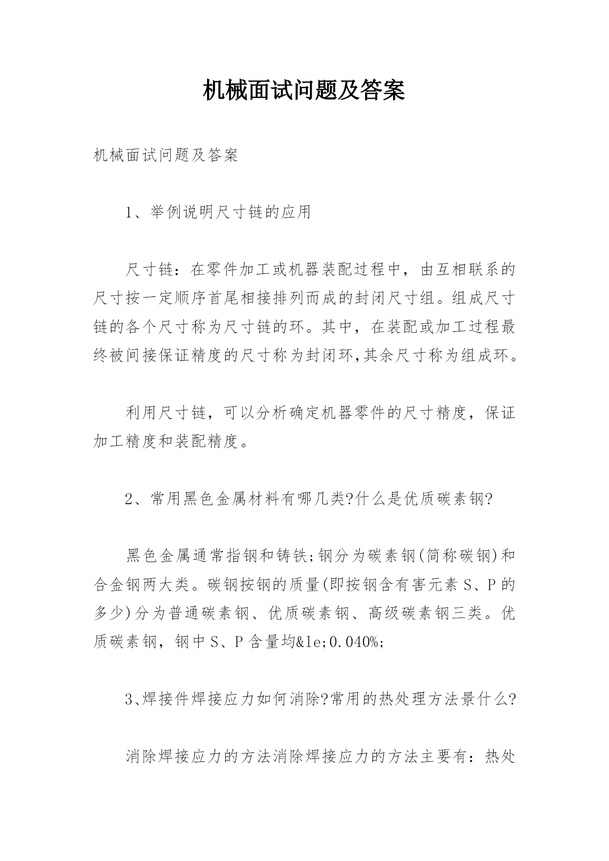 机械面试问题及答案机械面试问题及答案1、举例说明尺寸链的应用尺寸链:在零件加工或机器装配过程中,由互相联系的尺寸按一定顺序首尾相接排列而成的封闭尺寸组。组成尺寸链的各个尺寸称为尺寸链的环。其中,在装配或加工过程最终被间接保证精度的尺寸称为封闭环,其余尺寸称为组成环。利用尺寸链,可以分析确定机器零件的尺寸精度,保证加工精度和装配精度。2、常用黑色金属材料有哪几类?什么是优质碳素钢?黑色金属通常指钢和铸铁;钢分为碳素钢(简称碳钢)和合金钢两大类。碳钢按钢的质量(即按钢含有害元素S、P的多少)分为普通碳素钢、优