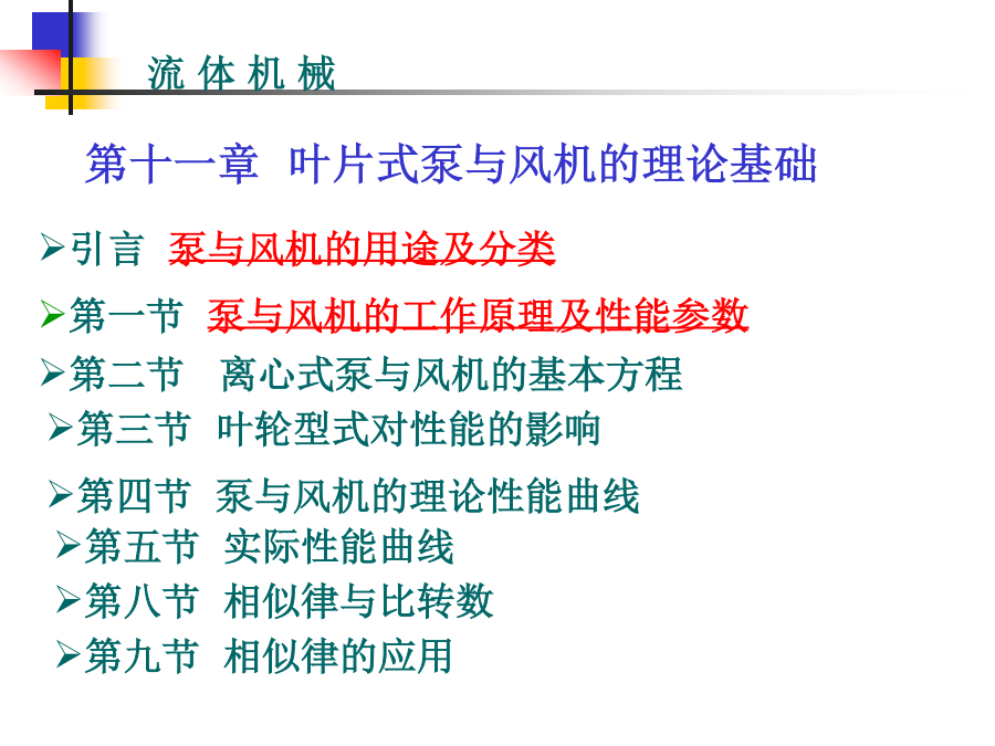 第十一章叶片式泵与风机的理论基础引言:泵与风机的用途及分类二、泵与风机的分类离心泵示意图2)轴流式泵与风机3)混流式泵与风机2.容积式泵与风机往复式泵示意图2)旋转式齿轮泵示意图3.其它形式的泵与风机射流泵示意图1-喷嘴;2-吸入室;3-混合管;4-扩散管按流体的压力大小不同,泵与风机通常又可分为低压、中压和高压三类:鼓风机鼓风机的全风压一般在10~15KPa至290~340KPa之间;第一节离心式泵与风机的工作原理及性能参数二、离心式泵与风机的性能参数2.压头H单位重量流体所获得的能量,即单位重量流体从