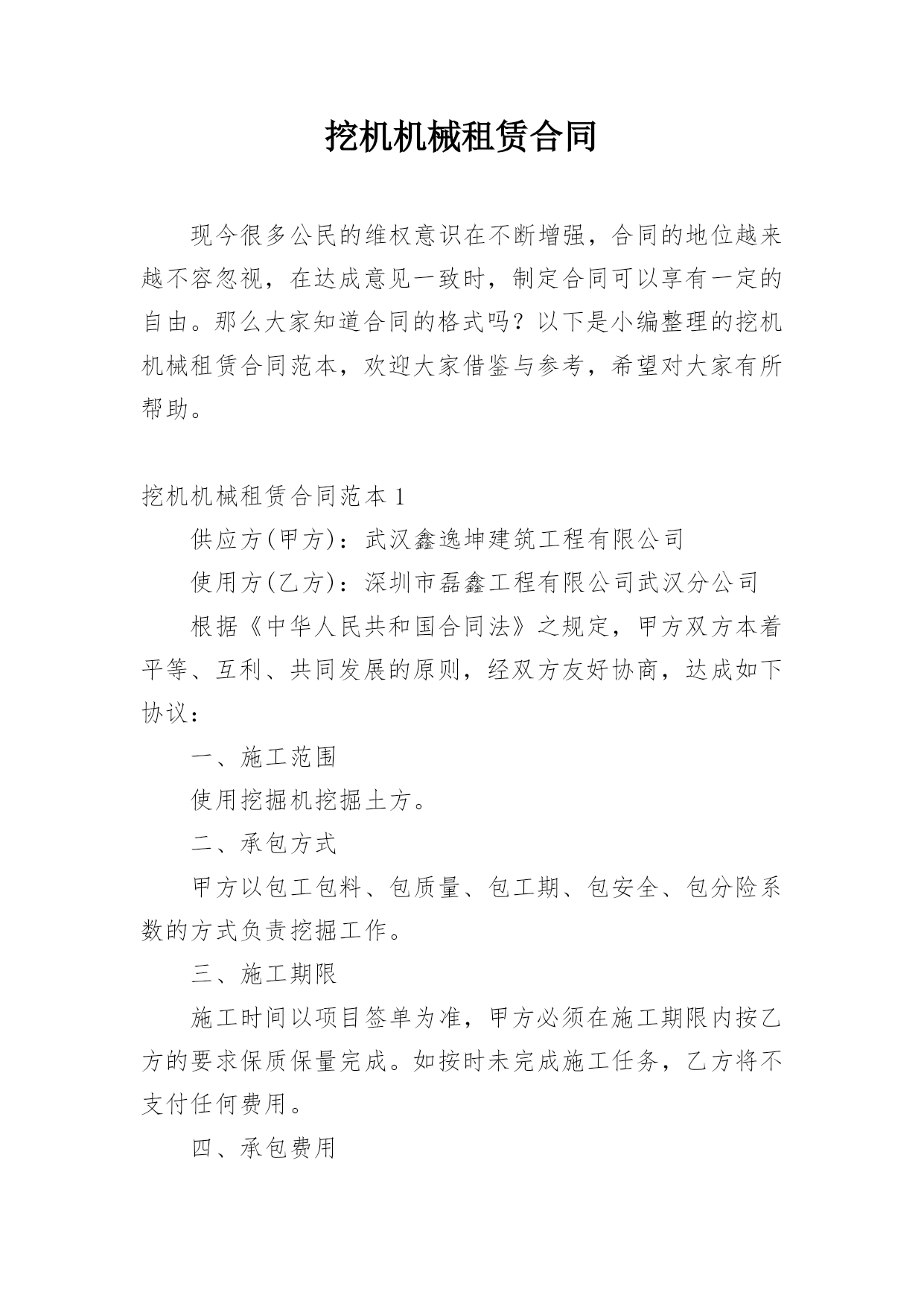 挖机机械租赁合同现今很多公民的维权意识在不断增强,合同的地位越来越不容忽视,在达成意见一致时,制定合同可以享有一定的自由。那么大家知道合同的格式吗?以下是小编整理的挖机机械租赁合同范本,欢迎大家借鉴与参考,希望对大家有所帮助。挖机机械租赁合同范本1供应方(甲方):武汉鑫逸坤建筑工程有限公司使用方(乙方):深圳市磊鑫工程有限公司武汉分公司根据《中华人民共和国合同法》之规定,甲方双方本着平等、互利、共同发展的原则,经双方友好协商,达成如下协议:一、施工范围使用挖掘机挖掘土方。二、承包方式甲方以包工包料、包质量