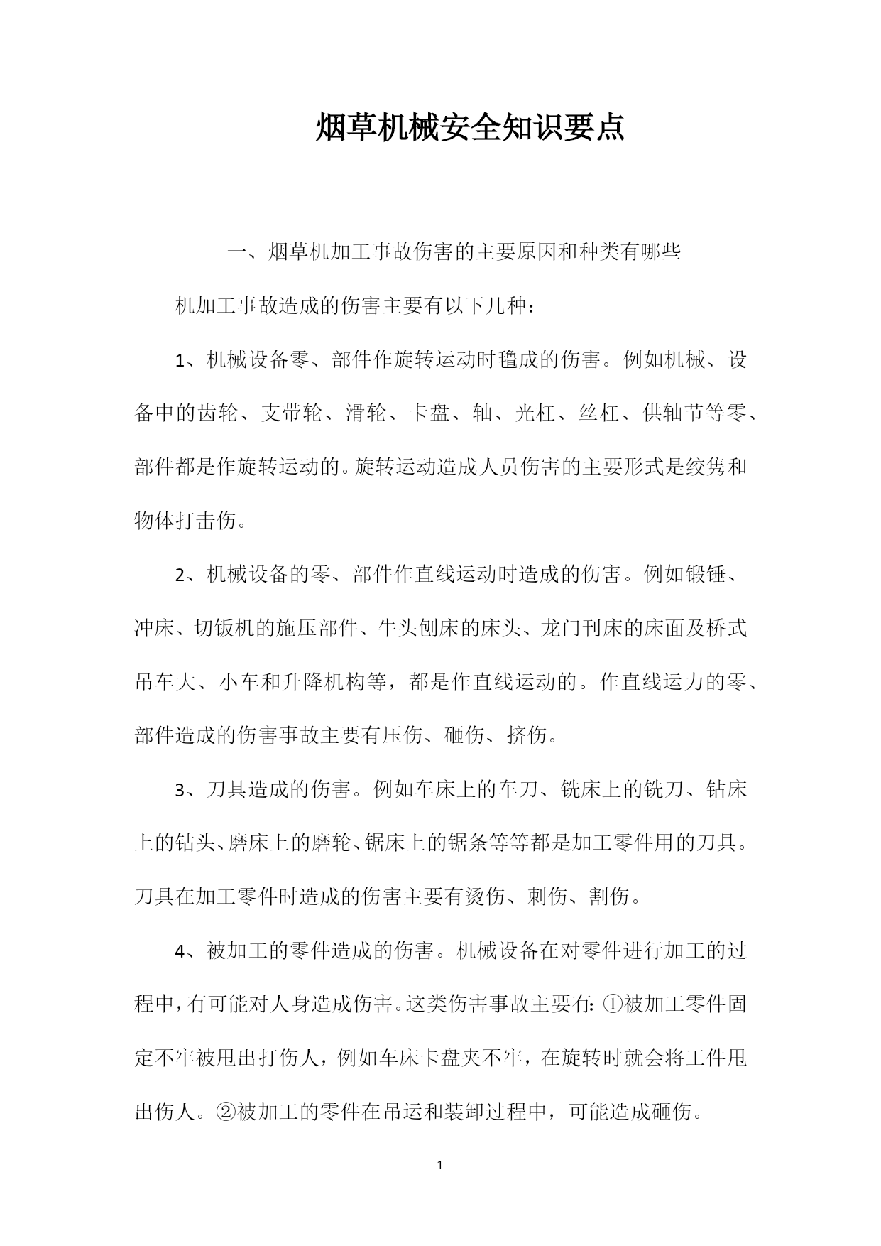PAGEPAGE7烟草机械安全知识要点一、烟草机加工事故伤害的主要原因和种类有哪些机加工事故造成的伤害主要有以下几种:1、机械设备零、部件作旋转运动时氇成的伤害。例如机械、设备中的齿轮、支带轮、滑轮、卡盘、轴、光杠、丝杠、供轴节等零、部件都是作旋转运动的。旋转运动造成人员伤害的主要形式是绞隽和物体打击伤。2、机械设备的零、部件作直线运动时造成的伤害。例如锻锤、冲床、切钣机的施压部件、牛头刨床的床头、龙门刊床的床面及桥式吊车大、小车和升降机构等,都是作直线运动的。作直线运力的零、部件造成的伤害事