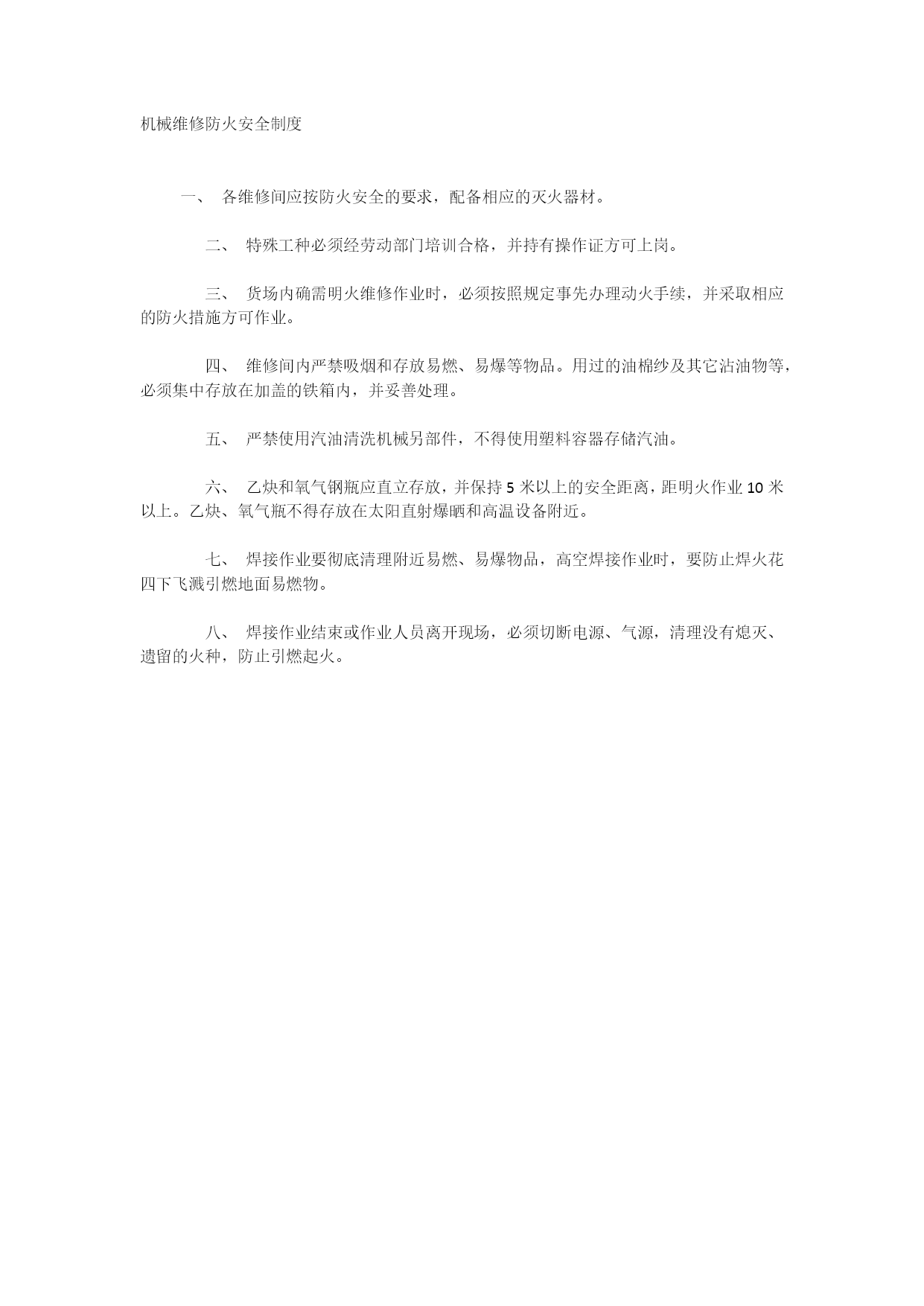 机械维修防火安全制度一、各维修间应按防火安全的要求,配备相应的灭火器材。二、特殊工种必须经劳动部门培训合格,并持有操作证方可上岗。三、货场内确需明火维修作业时,必须按照规定事先办理动火手续,并采取相应的防火措施方可作业。四、维修间内严禁吸烟和存放易燃、易爆等物品。用过的油棉纱及其它沾油物等,必须集中存放在加盖的铁箱内,并妥善处理。五、严禁使用汽油清洗机械另部件,不得使用塑料容器存储汽油。六、乙炔和氧气钢瓶应直立存放,并保持5米以上的安全距离,距明火作业10米以上。乙炔、氧气瓶不得存放在太阳直射爆晒和高温设
