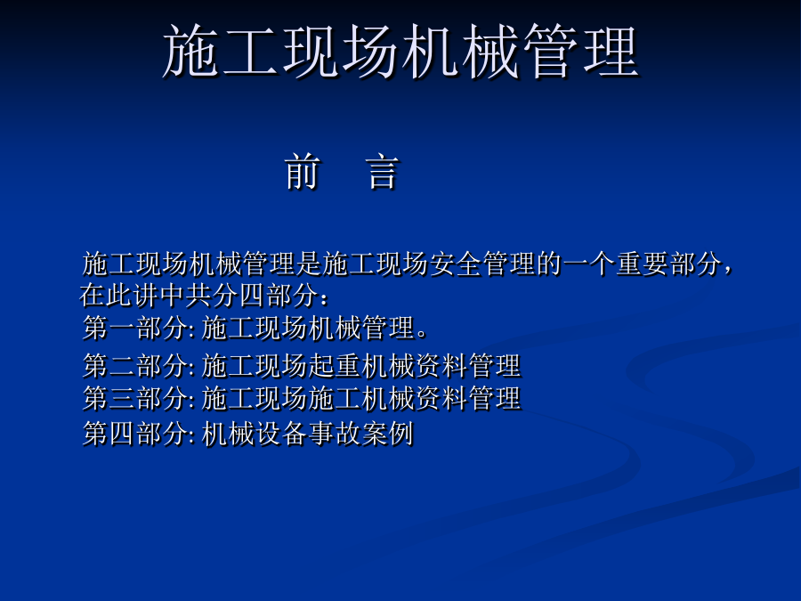 施工现场机械管理施工现场机械管理一、施工现场机械设备简介:(一)建筑施工机械化的必要性1、随着科技发展,施工现场机械化程度逐步提高,使广大建筑工人从繁重的体力劳动中解脱出来,一些劳动强度大、劳动条件恶劣的作业,大部分被机械作业所代替,因而减轻了劳动强度,改善了劳动条件,为文明施工创造条件,尤其可以完成人力无法实现的作业,扩大了施工范围。2、“在建筑工程上速度是最大的经济”,缩短建设周期,提前投产使用都将取得可观的经济效益。建筑施工企业的经济效益和社会效益都体现在建筑速度上,加快建设速度的关键在于提高施工机