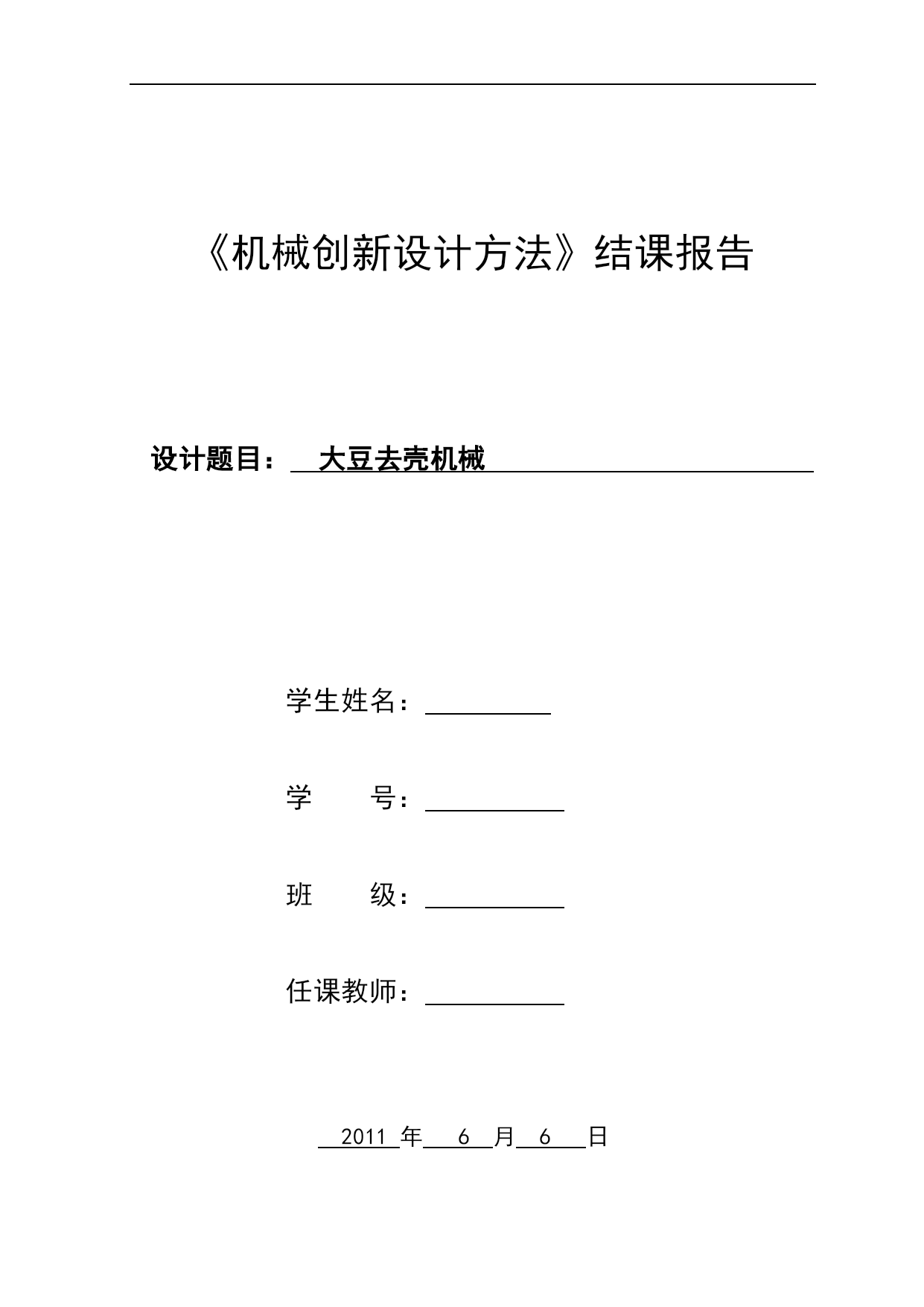 PAGE-4-《机械创新设计方法》结课报告设计题目:大豆去壳机械学生姓名:学号:班级:任课教师:2011年6月6日一.拟定设计任务书(设计原由,设计技术条件,设计内容,设计对象说明)设计原由:在农村里,大豆是一种普遍种植的经济作物,农民把大都收割回来以后会在太阳下暴晒,然后用棒槌敲击,让大豆从豆荚中脱离。棒打大豆杆是一件非常劳累的事,而且容易扭伤手臂。所以设计这个大豆去壳机械能很好解决这些问题。设计技术条件:设计内容:设计对象说明:二.功能原理与工作原理分析功能原理:利用曲柄摇杆的急回特性以及摇杆的