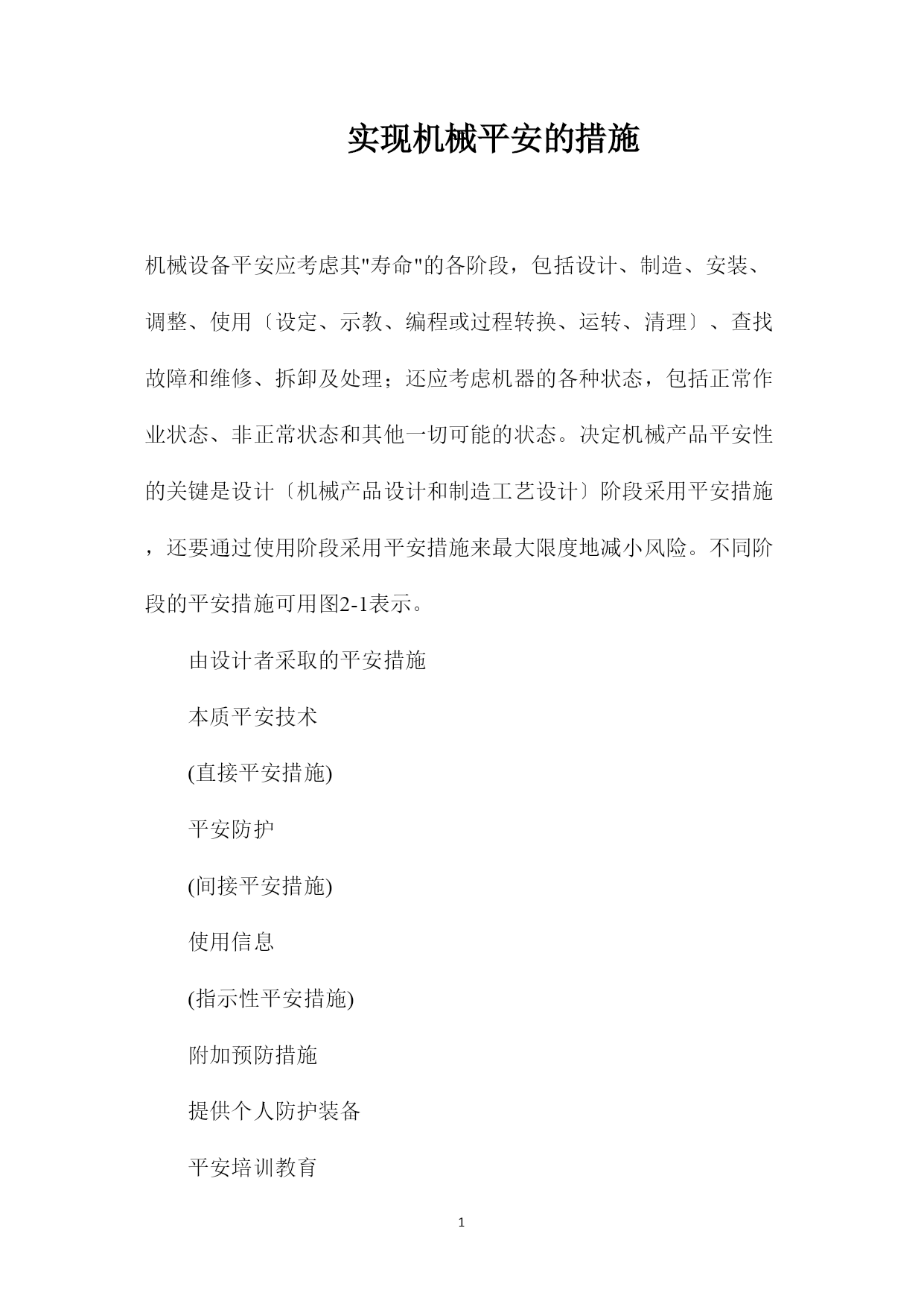 PAGEPAGE3实现机械平安的措施机械设备平安应考虑其"寿命"的各阶段,包括设计、制造、安装、调整、使用〔设定、示教、编程或过程转换、运转、清理〕、查找故障和维修、拆卸及处理;还应考虑机器的各种状态,包括正常作业状态、非正常状态和其他一切可能的状态。决定机械产品平安性的关键是设计〔机械产品设计和制造工艺设计〕阶段采用平安措施,还要通过使用阶段采用平安措施来最大限度地减小风险。不同阶段的平安措施可用图2-1表示。由设计者采取的平安措施本质平安技术(直接平安措施)平安防护(间接平安措施)使用信息