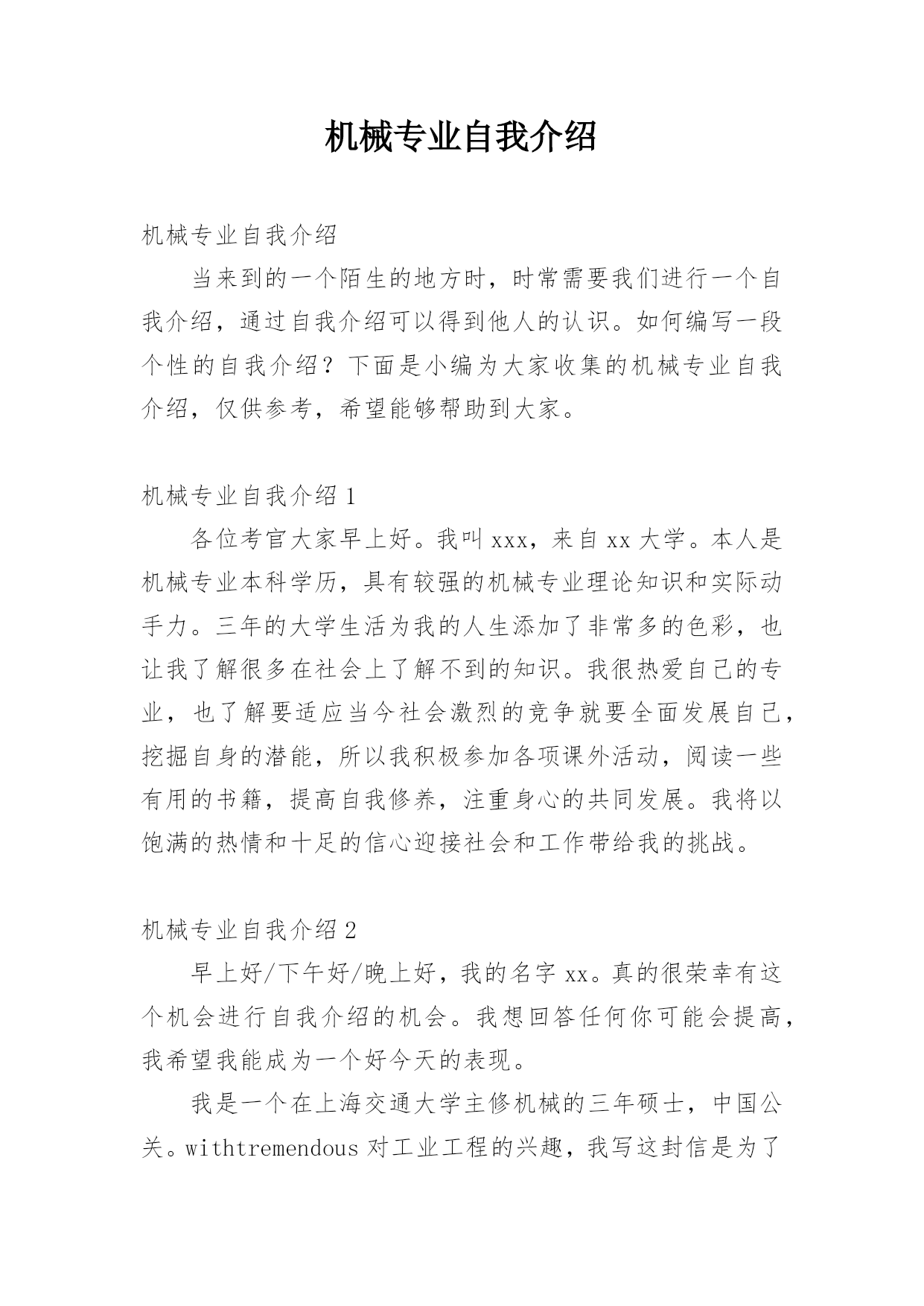 机械专业自我介绍机械专业自我介绍当来到的一个陌生的地方时,时常需要我们进行一个自我介绍,通过自我介绍可以得到他人的认识。如何编写一段个性的自我介绍?下面是小编为大家收集的机械专业自我介绍,仅供参考,希望能够帮助到大家。机械专业自我介绍1各位考官大家早上好。我叫xxx,来自xx大学。本人是机械专业本科学历,具有较强的机械专业理论知识和实际动手力。三年的大学生活为我的人生添加了非常多的色彩,也让我了解很多在社会上了解不到的知识。我很热爱自己的专业,也了解要适应当今社会激烈的竞争就要全面发展自己,挖掘自身的潜能