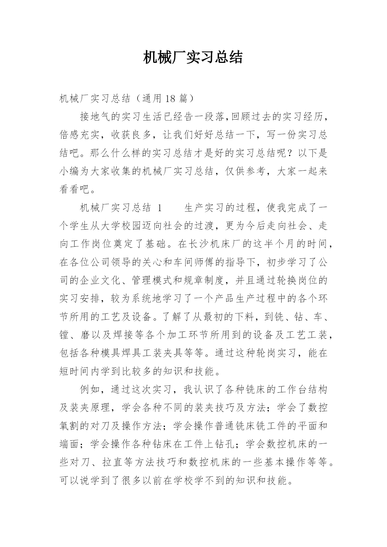 机械厂实习总结机械厂实习总结(通用18篇)接地气的实习生活已经告一段落,回顾过去的实习经历,倍感充实,收获良多,让我们好好总结一下,写一份实习总结吧。那么什么样的实习总结才是好的实习总结呢?以下是小编为大家收集的机械厂实习总结,仅供参考,大家一起来看看吧。机械厂实习总结1生产实习的过程,使我完成了一个学生从大学校园迈向社会的过渡,更为今后走向社会、走向工作岗位奠定了基础。在长沙机床厂的这半个月的时间,在各位公司领导的关心和车间师傅的指导下,初步学习了公司的企业文化、管理模式和规章制度,并且通过轮换岗位的实