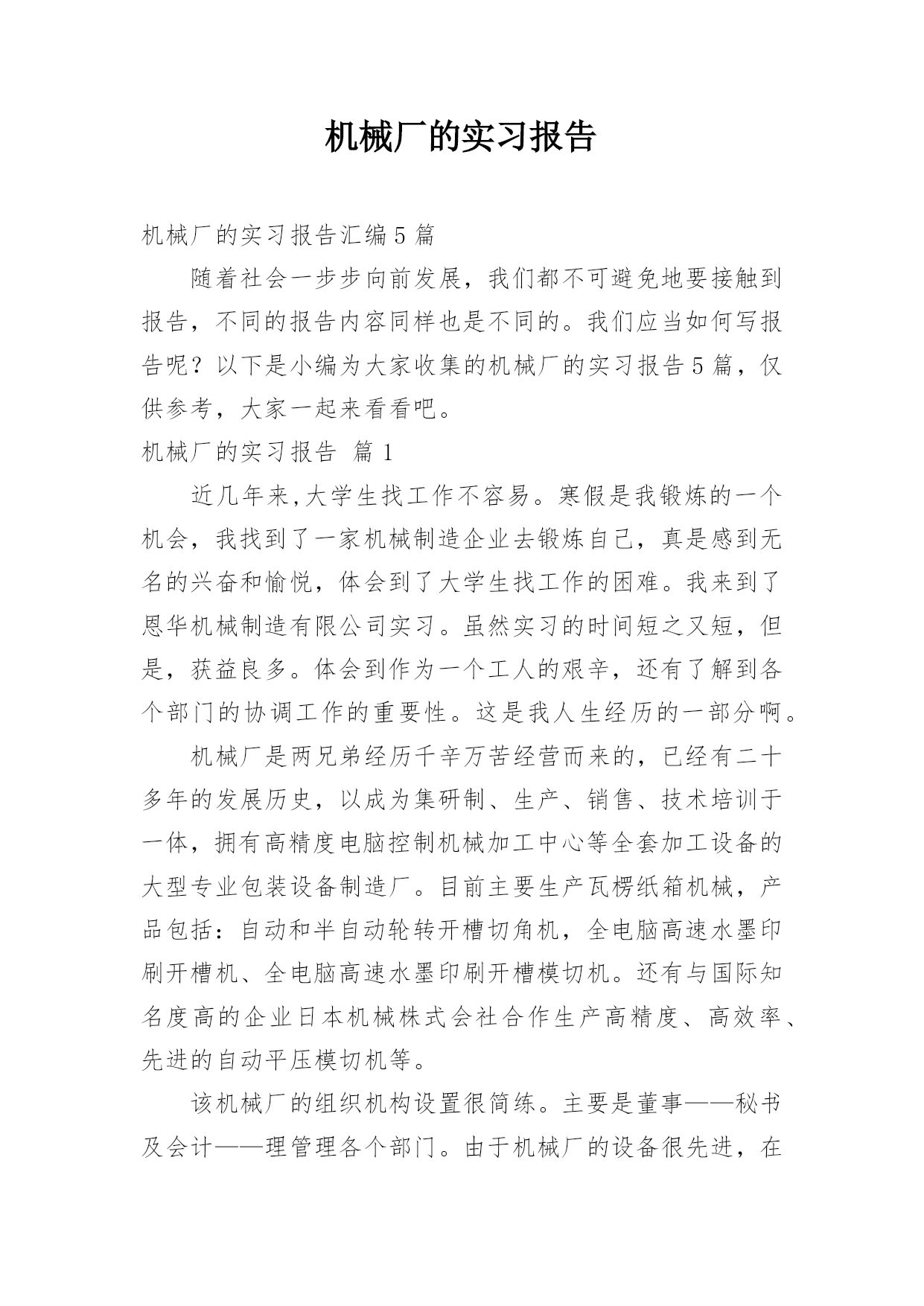 机械厂的实习报告机械厂的实习报告汇编5篇随着社会一步步向前发展,我们都不可避免地要接触到报告,不同的报告内容同样也是不同的。我们应当如何写报告呢?以下是小编为大家收集的机械厂的实习报告5篇,仅供参考,大家一起来看看吧。机械厂的实习报告篇1近几年来,大学生找工作不容易。寒假是我锻炼的一个机会,我找到了一家机械制造企业去锻炼自己,真是感到无名的兴奋和愉悦,体会到了大学生找工作的困难。我来到了恩华机械制造有限公司实习。虽然实习的时间短之又短,但是,获益良多。体会到作为一个工人的艰辛,还有了解到各个部门的协调工作