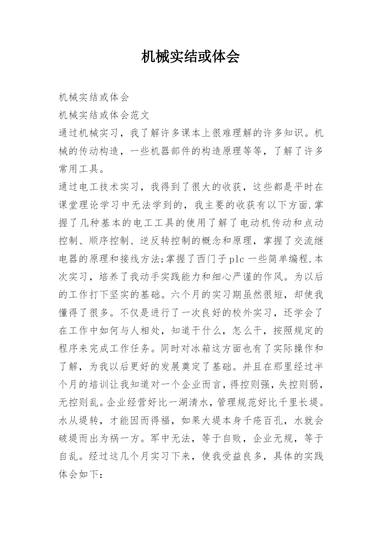 机械实结或体会机械实结或体会机械实结或体会范文通过机械实习,我了解许多课本上很难理解的许多知识。机械的传动构造,一些机器部件的构造原理等等,了解了许多常用工具。通过电工技术实习,我得到了很大的收获,这些都是平时在课堂理论学习中无法学到的,我主要的收获有以下方面.掌握了几种基本的电工工具的使用了解了电动机传动和点动控制、顺序控制、逆反转控制的概念和原理,掌握了交流继电器的原理和接线方法;掌握了西门子plc一些简单编程.本次实习,培养了我动手实践能力和细心严谨的作风。为以后的工作打下坚实的基础。六个月的实习期