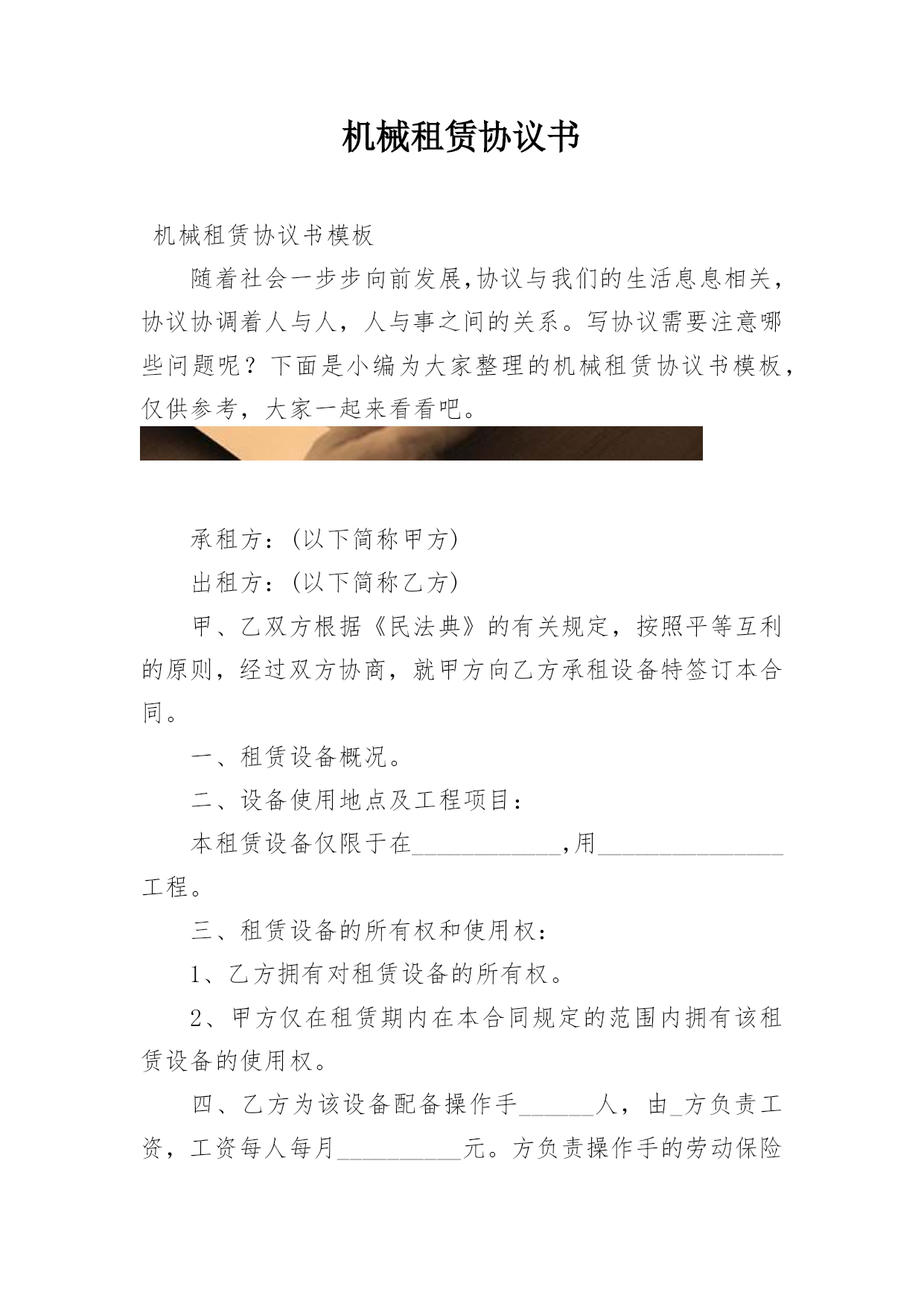 机械租赁协议书机械租赁协议书模板随着社会一步步向前发展,协议与我们的生活息息相关,协议协调着人与人,人与事之间的关系。写协议需要注意哪些问题呢?下面是小编为大家整理的机械租赁协议书模板,仅供参考,大家一起来看看吧。承租方:(以下简称甲方)出租方:(以下简称乙方)甲、乙双方根据《民法典》的有关规定,按照平等互利的原则,经过双方协商,就甲方向乙方承租设备特签订本合同。一、租赁设备概况。二、设备使用地点及工程项目:本租赁设备仅限于在____________,用_______________工程。三、租赁设备的所