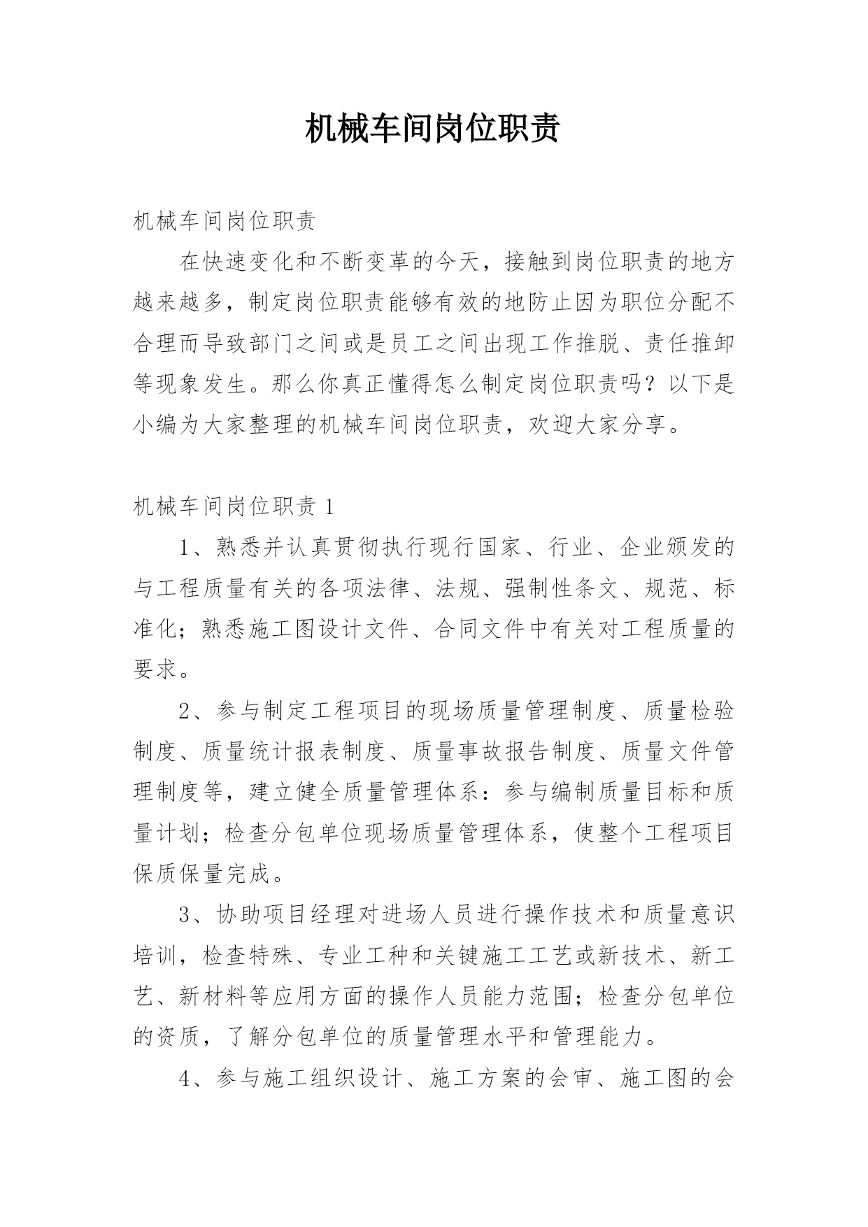 机械车间岗位职责机械车间岗位职责在快速变化和不断变革的今天,接触到岗位职责的地方越来越多,制定岗位职责能够有效的地防止因为职位分配不合理而导致部门之间或是员工之间出现工作推脱、责任推卸等现象发生。那么你真正懂得怎么制定岗位职责吗?以下是小编为大家整理的机械车间岗位职责,欢迎大家分享。机械车间岗位职责11、熟悉并认真贯彻执行现行国家、行业、企业颁发的与工程质量有关的各项法律、法规、强制性条文、规范、标准化;熟悉施工图设计文件、合同文件中有关对工程质量的要求。2、参与制定工程项目的现场质量管理制度、质量检验制