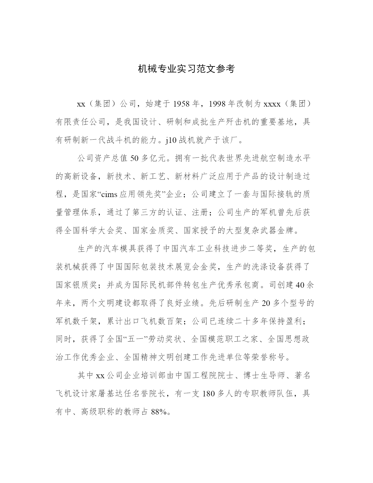 机械专业实习范文参考xx(集团)公司,始建于1958年,1998年改制为xxxx(集团)有限责任公司,是我国设计、研制和成批生产歼击机的重要基地,具有研制新一代战斗机的能力。j10战机就产于该厂。公司资产总值50多亿元。拥有一批代表世界先进航空制造水平的高新设备,新技术、新工艺、新材料广泛应用于产品的设计制造过程,是国家“cims应用领先奖”企业;公司建立了一套与国际接轨的质量管理体系,通过了第三方的认证、注册;公司生产的军机曾先后获得全国科学大会奖、国家金质奖、国家授予的大型复杂武器金牌。生产的汽车模具