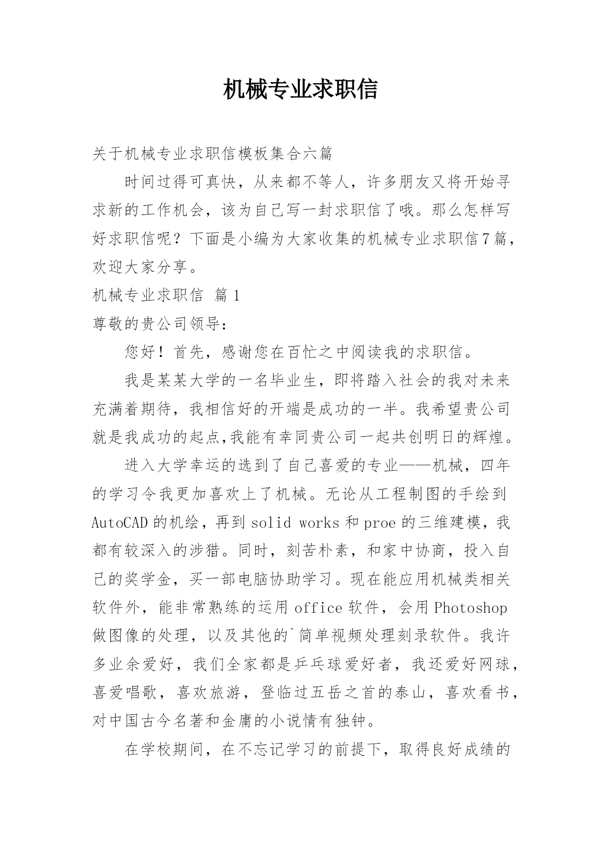 机械专业求职信关于机械专业求职信模板集合六篇时间过得可真快,从来都不等人,许多朋友又将开始寻求新的工作机会,该为自己写一封求职信了哦。那么怎样写好求职信呢?下面是小编为大家收集的机械专业求职信7篇,欢迎大家分享。机械专业求职信篇1尊敬的贵公司领导:您好!首先,感谢您在百忙之中阅读我的求职信。我是某某大学的一名毕业生,即将踏入社会的我对未来充满着期待,我相信好的开端是成功的一半。我希望贵公司就是我成功的起点,我能有幸同贵公司一起共创明日的辉煌。进入大学幸运的选到了自己喜爱的专业——机械,四年的学习令我更加喜