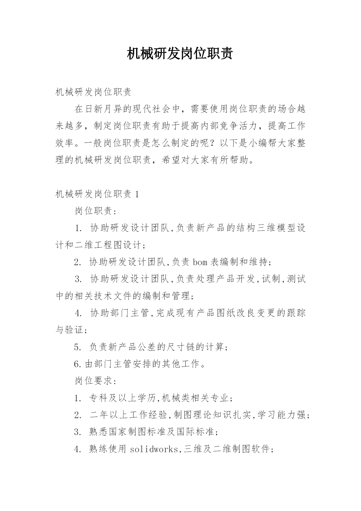 机械研发岗位职责机械研发岗位职责在日新月异的现代社会中,需要使用岗位职责的场合越来越多,制定岗位职责有助于提高内部竞争活力,提高工作效率。一般岗位职责是怎么制定的呢?以下是小编帮大家整理的机械研发岗位职责,希望对大家有所帮助。机械研发岗位职责1岗位职责:1.协助研发设计团队,负责新产品的结构三维模型设计和二维工程图设计;2.协助研发设计团队,负责bom表编制和维持;3.协助研发设计团队,负责处理产品开发,试制,测试中的相关技术文件的编制和管理;4.协助部门主管,完成现有产品图纸改良变更的跟踪与验证;5.负