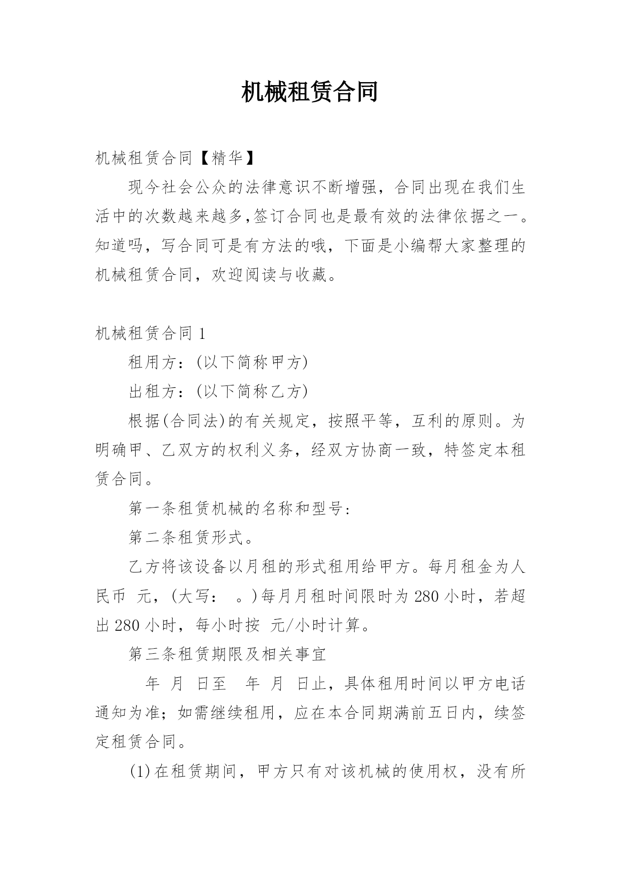 机械租赁合同机械租赁合同【精华】现今社会公众的法律意识不断增强,合同出现在我们生活中的次数越来越多,签订合同也是最有效的法律依据之一。知道吗,写合同可是有方法的哦,下面是小编帮大家整理的机械租赁合同,欢迎阅读与收藏。机械租赁合同1租用方:(以下简称甲方)出租方:(以下简称乙方)根据(合同法)的有关规定,按照平等,互利的原则。为明确甲、乙双方的权利义务,经双方协商一致,特签定本租赁合同。第一条租赁机械的名称和型号:第二条租赁形式。乙方将该设备以月租的形式租用给甲方。每月租金为人民币元,(大写:。)每月月租时