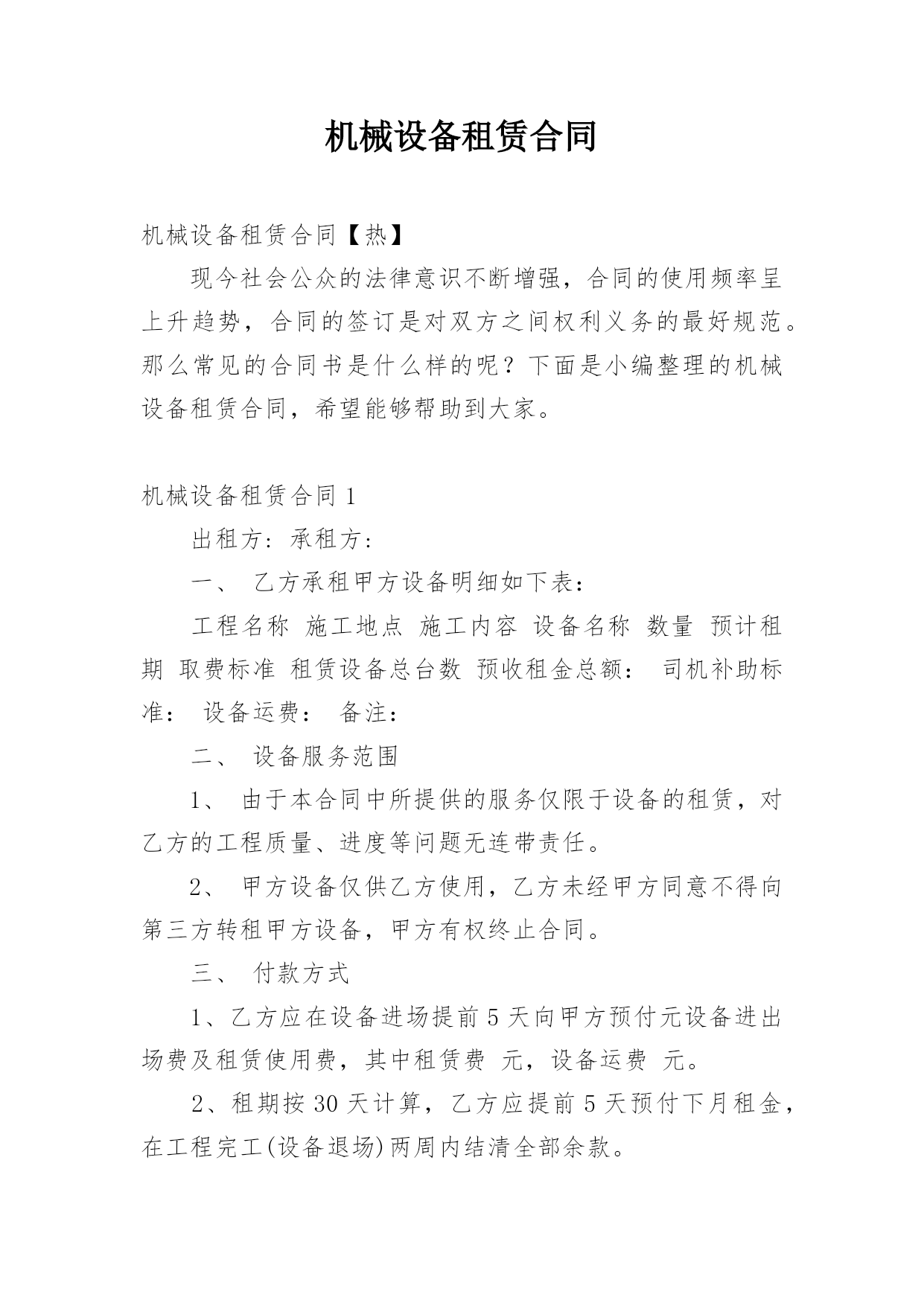 机械设备租赁合同机械设备租赁合同【热】现今社会公众的法律意识不断增强,合同的使用频率呈上升趋势,合同的签订是对双方之间权利义务的最好规范。那么常见的合同书是什么样的呢?下面是小编整理的机械设备租赁合同,希望能够帮助到大家。机械设备租赁合同1出租方:承租方:一、乙方承租甲方设备明细如下表:工程名称施工地点施工内容设备名称数量预计租期取费标准租赁设备总台数预收租金总额:司机补助标准:设备运费:备注:二、设备服务范围1、由于本合同中所提供的服务仅限于设备的租赁,对乙方的工程质量、进度等问题无连带责任。2、甲方设