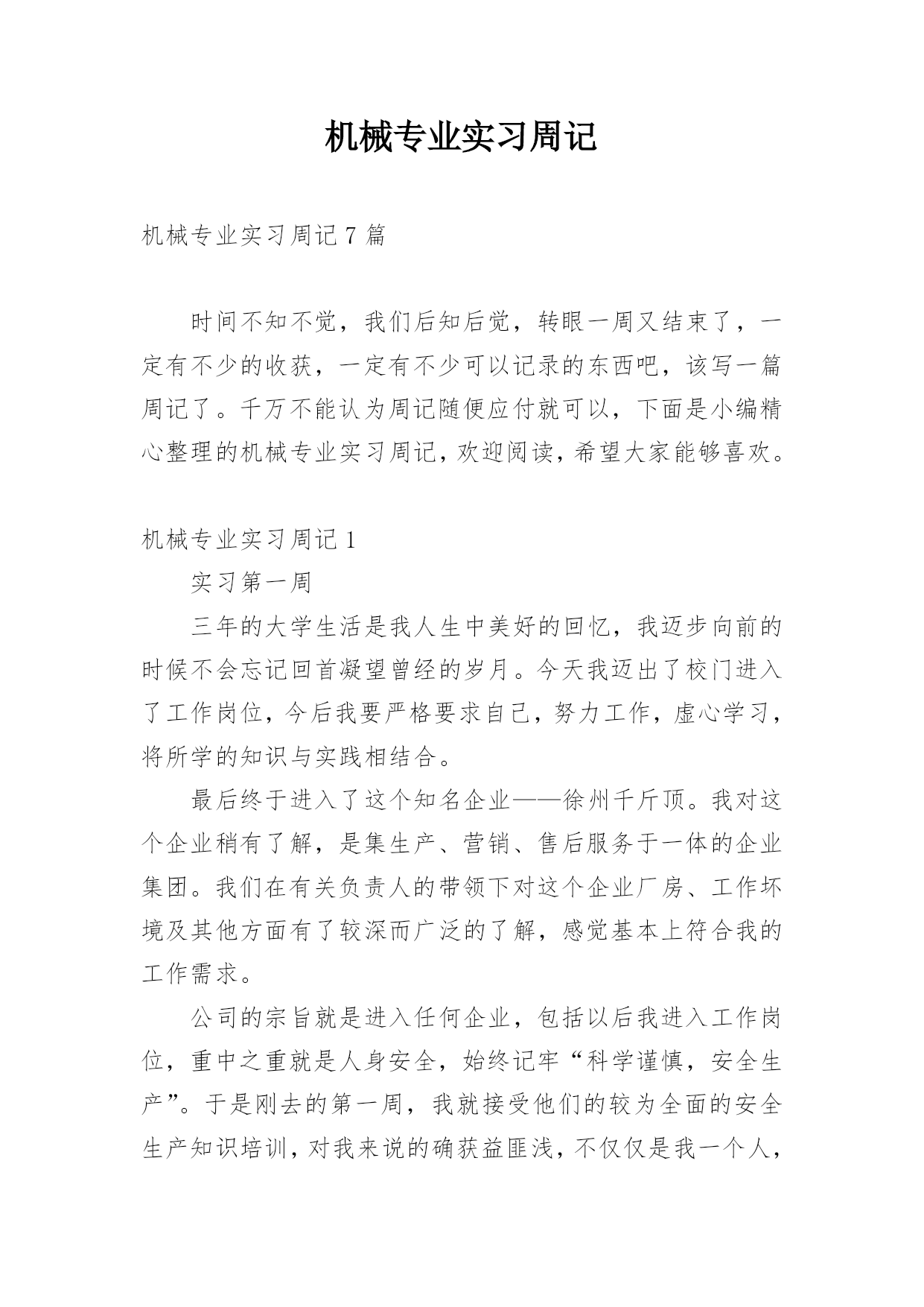 机械专业实习周记机械专业实习周记7篇时间不知不觉,我们后知后觉,转眼一周又结束了,一定有不少的收获,一定有不少可以记录的东西吧,该写一篇周记了。千万不能认为周记随便应付就可以,下面是小编精心整理的机械专业实习周记,欢迎阅读,希望大家能够喜欢。机械专业实习周记1实习第一周三年的大学生活是我人生中美好的回忆,我迈步向前的时候不会忘记回首凝望曾经的岁月。今天我迈出了校门进入了工作岗位,今后我要严格要求自己,努力工作,虚心学习,将所学的知识与实践相结合。最后终于进入了这个知名企业——徐州千斤顶。我对这个企业稍有了