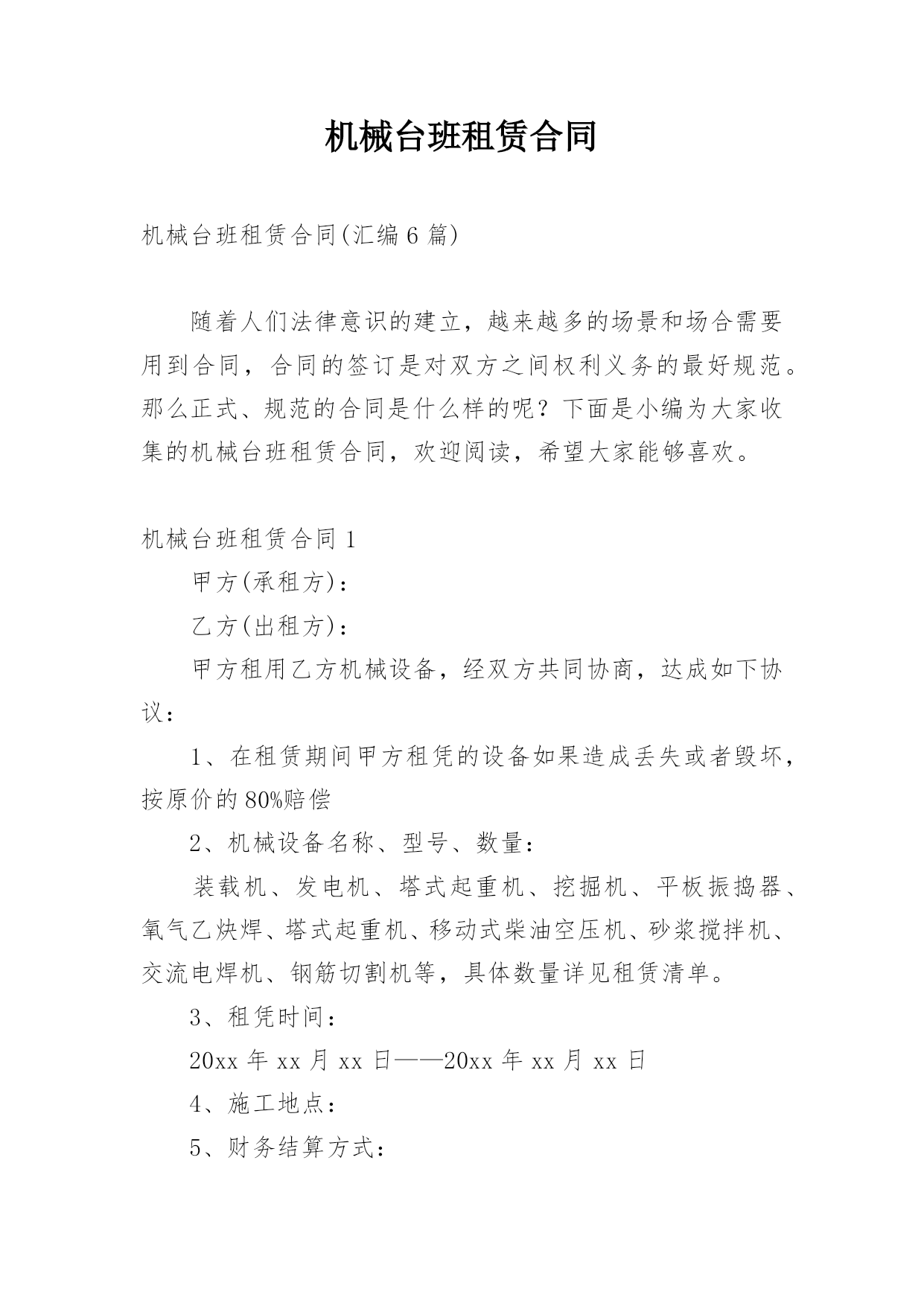 机械台班租赁合同机械台班租赁合同(汇编6篇)随着人们法律意识的建立,越来越多的场景和场合需要用到合同,合同的签订是对双方之间权利义务的最好规范。那么正式、规范的合同是什么样的呢?下面是小编为大家收集的机械台班租赁合同,欢迎阅读,希望大家能够喜欢。机械台班租赁合同1甲方(承租方):乙方(出租方):甲方租用乙方机械设备,经双方共同协商,达成如下协议:1、在租赁期间甲方租凭的设备如果造成丢失或者毁坏,按原价的80%赔偿2、机械设备名称、型号、数量:装载机、发电机、塔式起重机、挖掘机、平板振捣器、氧气乙炔焊、塔式