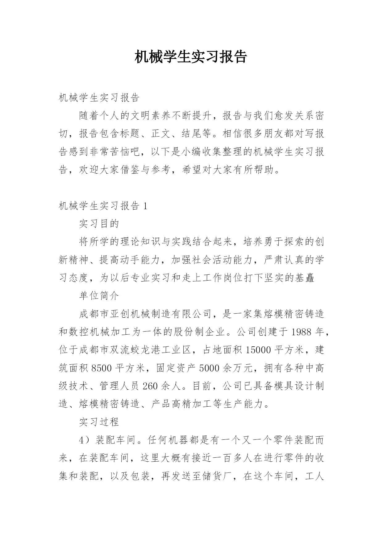 机械学生实习报告机械学生实习报告随着个人的文明素养不断提升,报告与我们愈发关系密切,报告包含标题、正文、结尾等。相信很多朋友都对写报告感到非常苦恼吧,以下是小编收集整理的机械学生实习报告,欢迎大家借鉴与参考,希望对大家有所帮助。机械学生实习报告1实习目的将所学的理论知识与实践结合起来,培养勇于探索的创新精神、提高动手能力,加强社会活动能力,严肃认真的学习态度,为以后专业实习和走上工作岗位打下坚实的基矗单位简介成都市亚创机械制造有限公司,是一家集熔模精密铸造和数控机械加工为一体的股份制企业。公司创建于198
