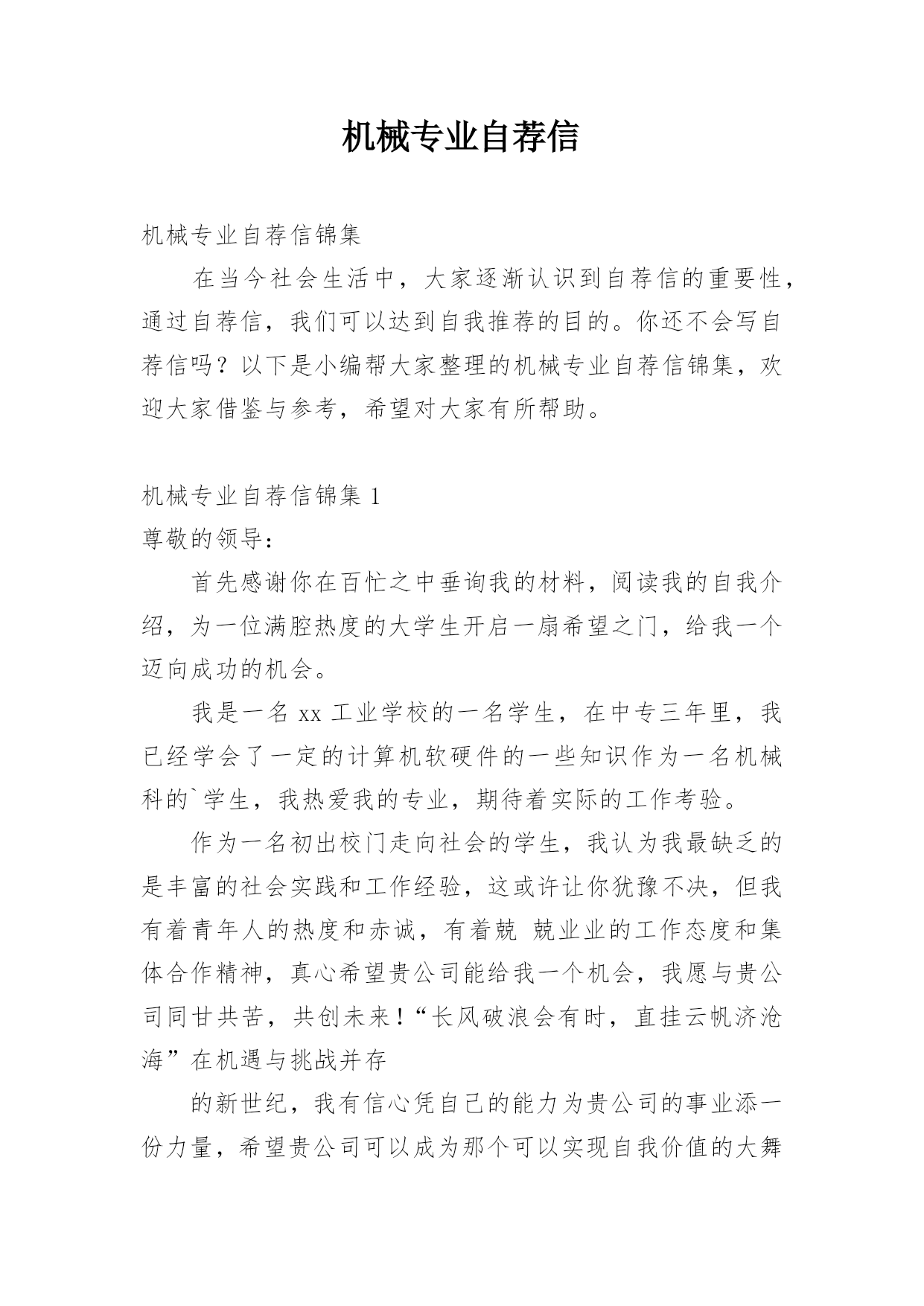 机械专业自荐信机械专业自荐信锦集在当今社会生活中,大家逐渐认识到自荐信的重要性,通过自荐信,我们可以达到自我推荐的目的。你还不会写自荐信吗?以下是小编帮大家整理的机械专业自荐信锦集,欢迎大家借鉴与参考,希望对大家有所帮助。机械专业自荐信锦集1尊敬的领导:首先感谢你在百忙之中垂询我的材料,阅读我的自我介绍,为一位满腔热度的大学生开启一扇希望之门,给我一个迈向成功的机会。我是一名xx工业学校的一名学生,在中专三年里,我已经学会了一定的计算机软硬件的一些知识作为一名机械科的`学生,我热爱我的专业,期待着实际的工