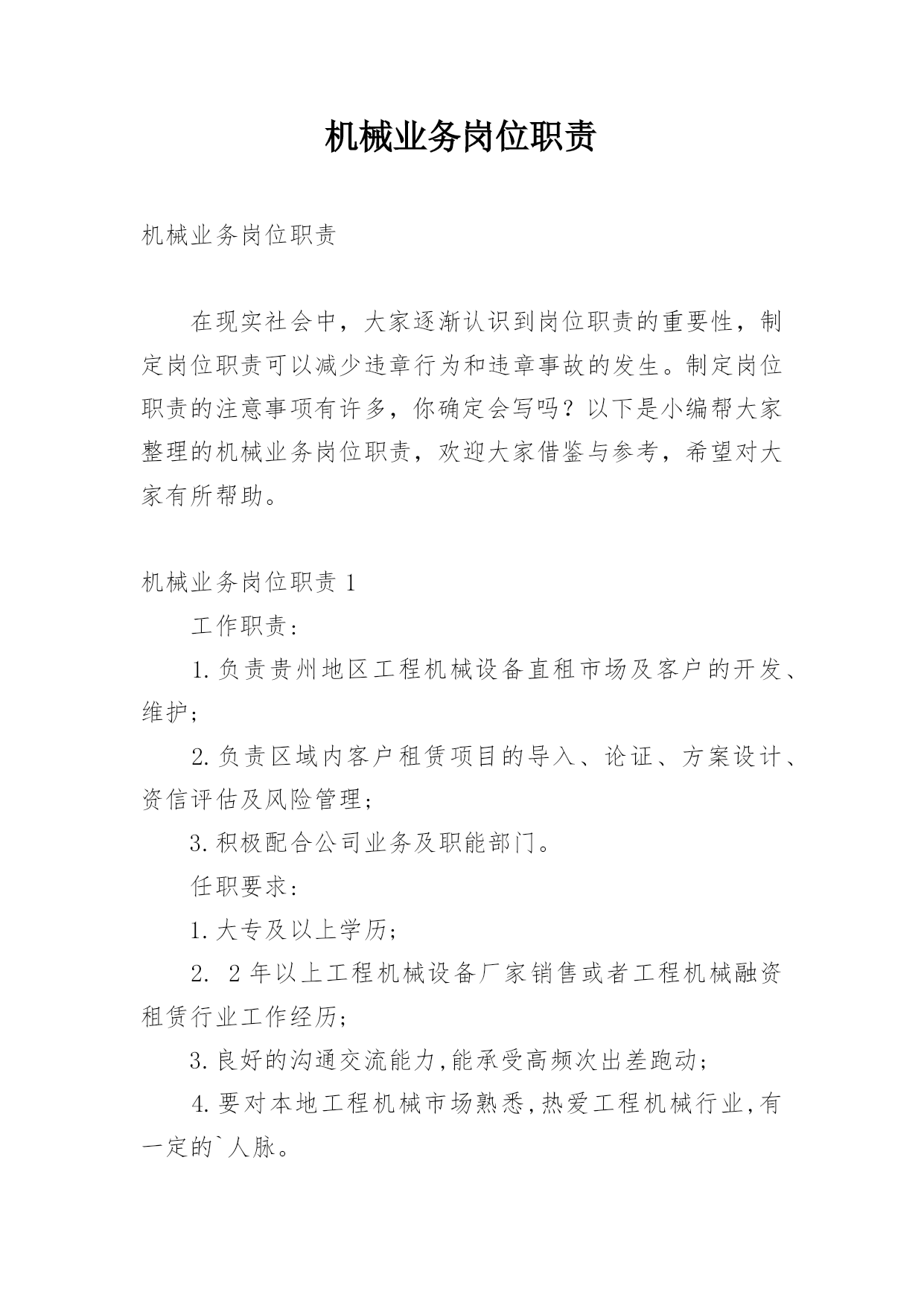 机械业务岗位职责机械业务岗位职责在现实社会中,大家逐渐认识到岗位职责的重要性,制定岗位职责可以减少违章行为和违章事故的发生。制定岗位职责的注意事项有许多,你确定会写吗?以下是小编帮大家整理的机械业务岗位职责,欢迎大家借鉴与参考,希望对大家有所帮助。机械业务岗位职责1工作职责:1.负责贵州地区工程机械设备直租市场及客户的开发、维护;2.负责区域内客户租赁项目的导入、论证、方案设计、资信评估及风险管理;3.积极配合公司业务及职能部门。任职要求:1.大专及以上学历;2.2年以上工程机械设备厂家销售或者工程机械融