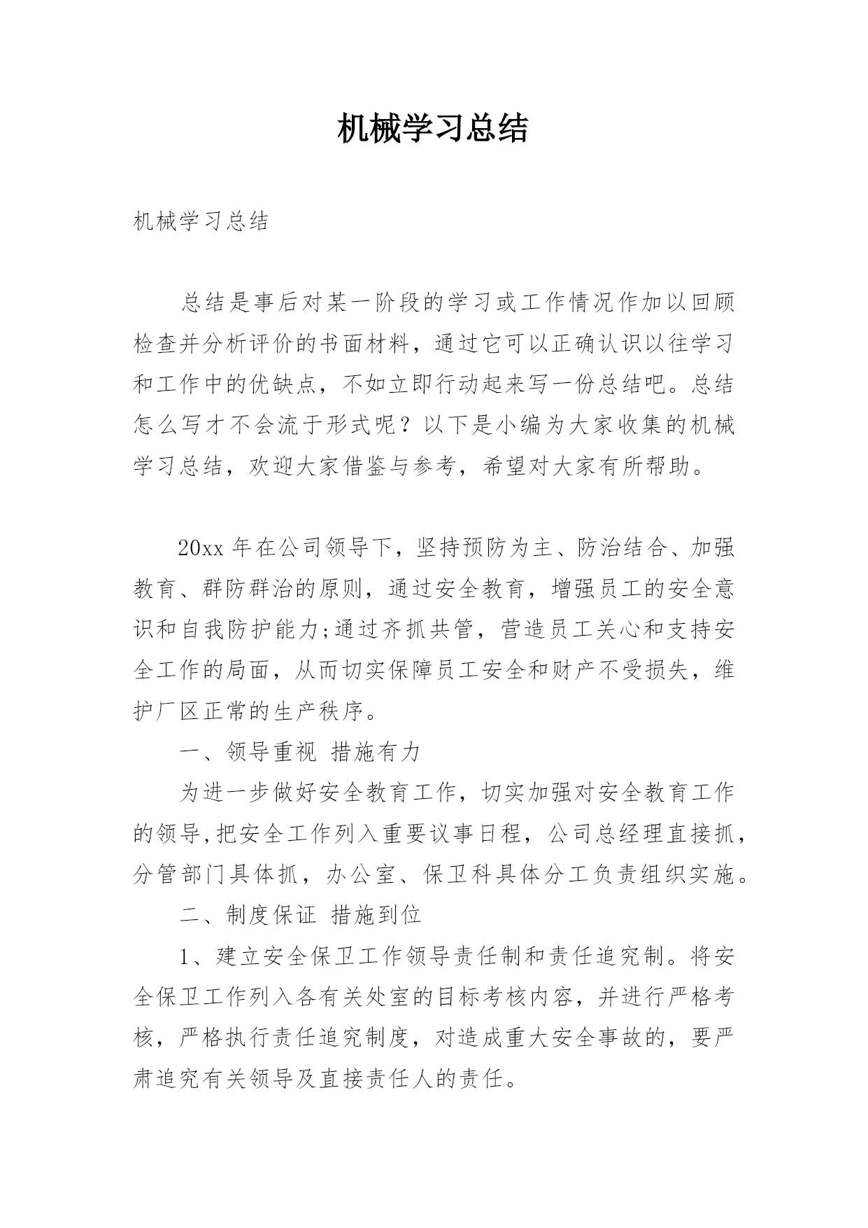 机械学习总结机械学习总结总结是事后对某一阶段的学习或工作情况作加以回顾检查并分析评价的书面材料,通过它可以正确认识以往学习和工作中的优缺点,不如立即行动起来写一份总结吧。总结怎么写才不会流于形式呢?以下是小编为大家收集的机械学习总结,欢迎大家借鉴与参考,希望对大家有所帮助。20xx年在公司领导下,坚持预防为主、防治结合、加强教育、群防群治的原则,通过安全教育,增强员工的安全意识和自我防护能力;通过齐抓共管,营造员工关心和支持安全工作的局面,从而切实保障员工安全和财产不受损失,维护厂区正常的生产秩序。一、领