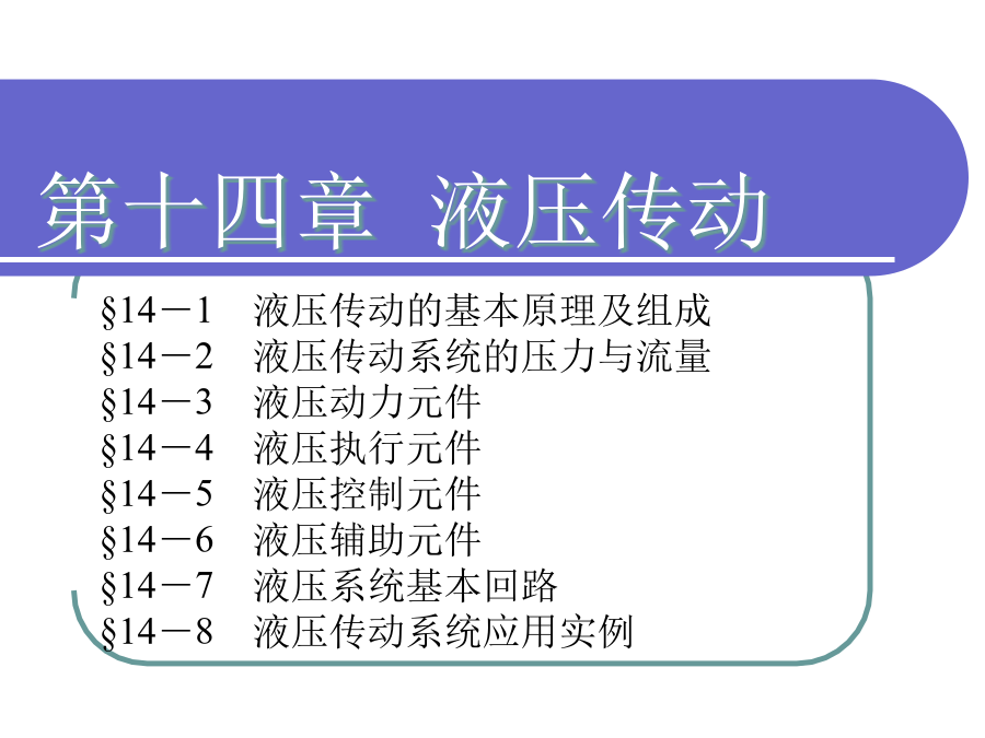 第十四章液压传动一、液压传动的基本原理二、液压传动系统的组成三、液压元件的图形符号四、液压传动的应用特点一、液压传动的基本原理1.泵吸油过程2.泵压油和重物举升过程3.重物落下过程二、液压传动系统的组成三、液压元件的图形符号四、液压传动的应用特点一、压力的形成及传递二、流量和平均流速三、压力损失及其与流量的关系四、液压油的选用一、压力的形成及传递2.液压系统压力的建立3.液压系统及元件的公称压力4.静压传递原理(帕斯卡原理)5.静压传递原理(帕斯卡原理)在液压传动中的应用【例1】液压千斤顶的压油过程中,柱