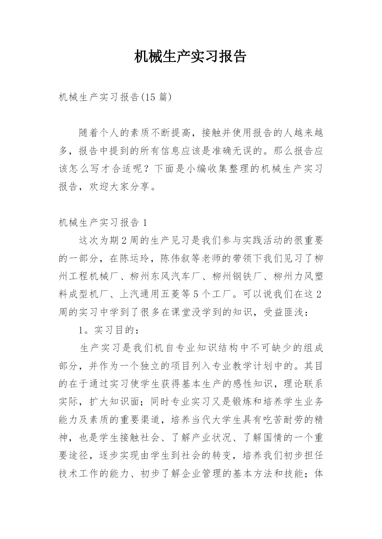 机械生产实习报告机械生产实习报告(15篇)随着个人的素质不断提高,接触并使用报告的人越来越多,报告中提到的所有信息应该是准确无误的。那么报告应该怎么写才合适呢?下面是小编收集整理的机械生产实习报告,欢迎大家分享。机械生产实习报告1这次为期2周的生产见习是我们参与实践活动的很重要的一部分,在陈运玲,陈伟叙等老师的带领下我们见习了柳州工程机械厂、柳州东风汽车厂、柳州钢铁厂、柳州力风塑料成型机厂、上汽通用五菱等5个工厂。可以说我们在这2周的实习中学到了很多在课堂没学到的知识,受益匪浅:1。实习目的:生产实习是我