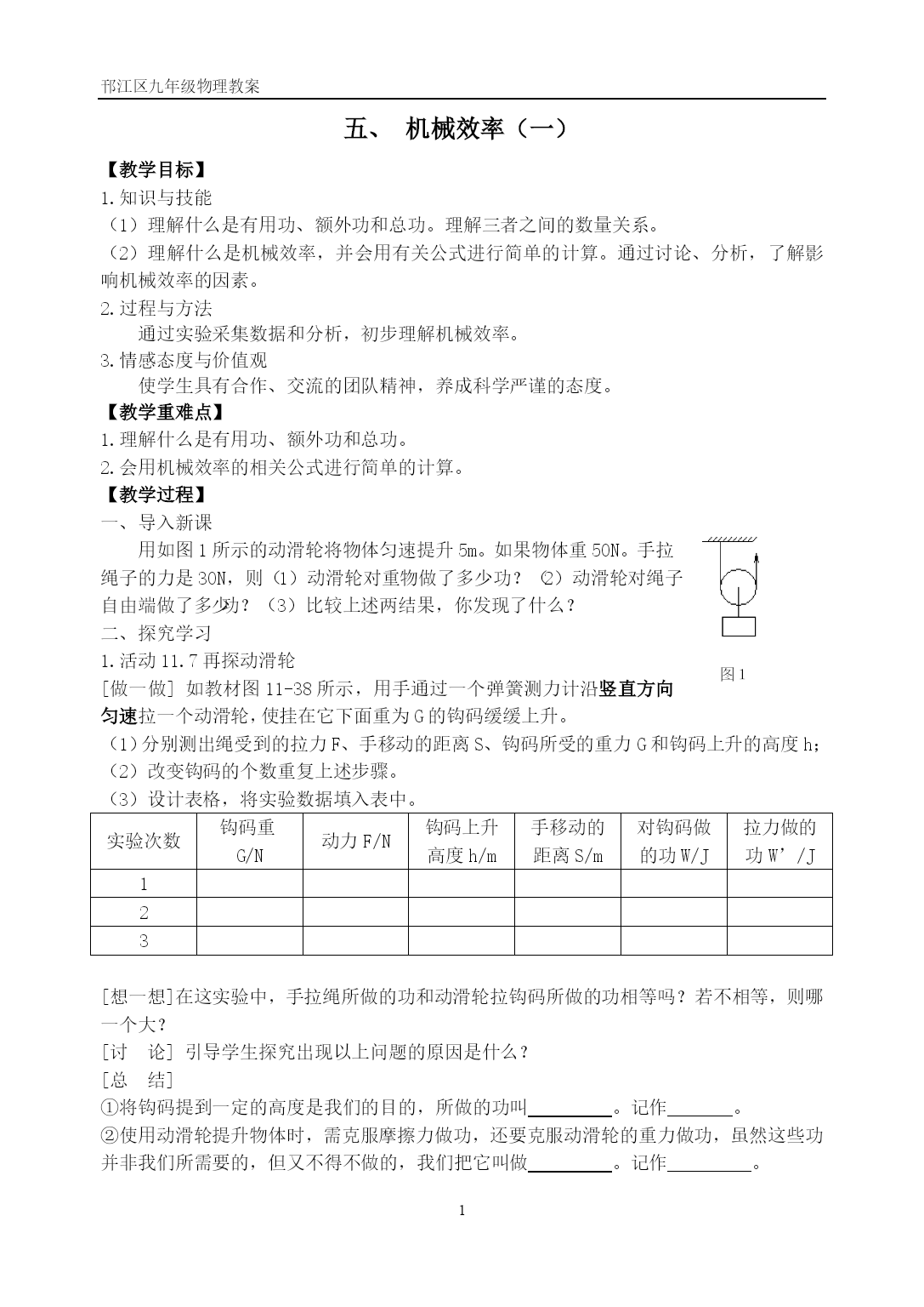 邗江区九年级物理教案PAGEPAGE2五、机械效率(一)【教学目标】1.知识与技能(1)理解什么是有用功、额外功和总功。理解三者之间的数量关系。(2)理解什么是机械效率,并会用有关公式进行简单的计算。通过讨论、分析,了解影响机械效率的因素。2.过程与方法通过实验采集数据和分析,初步理解机械效率。3.情感态度与价值观使学生具有合作、交流的团队精神,养成科学严谨的态度。【教学重难点】1.理解什么是有用功、额外功和总功。2.会用机械效率的相关公式进行简单的计算。【教学过程】图1一、导入新课用如图1所