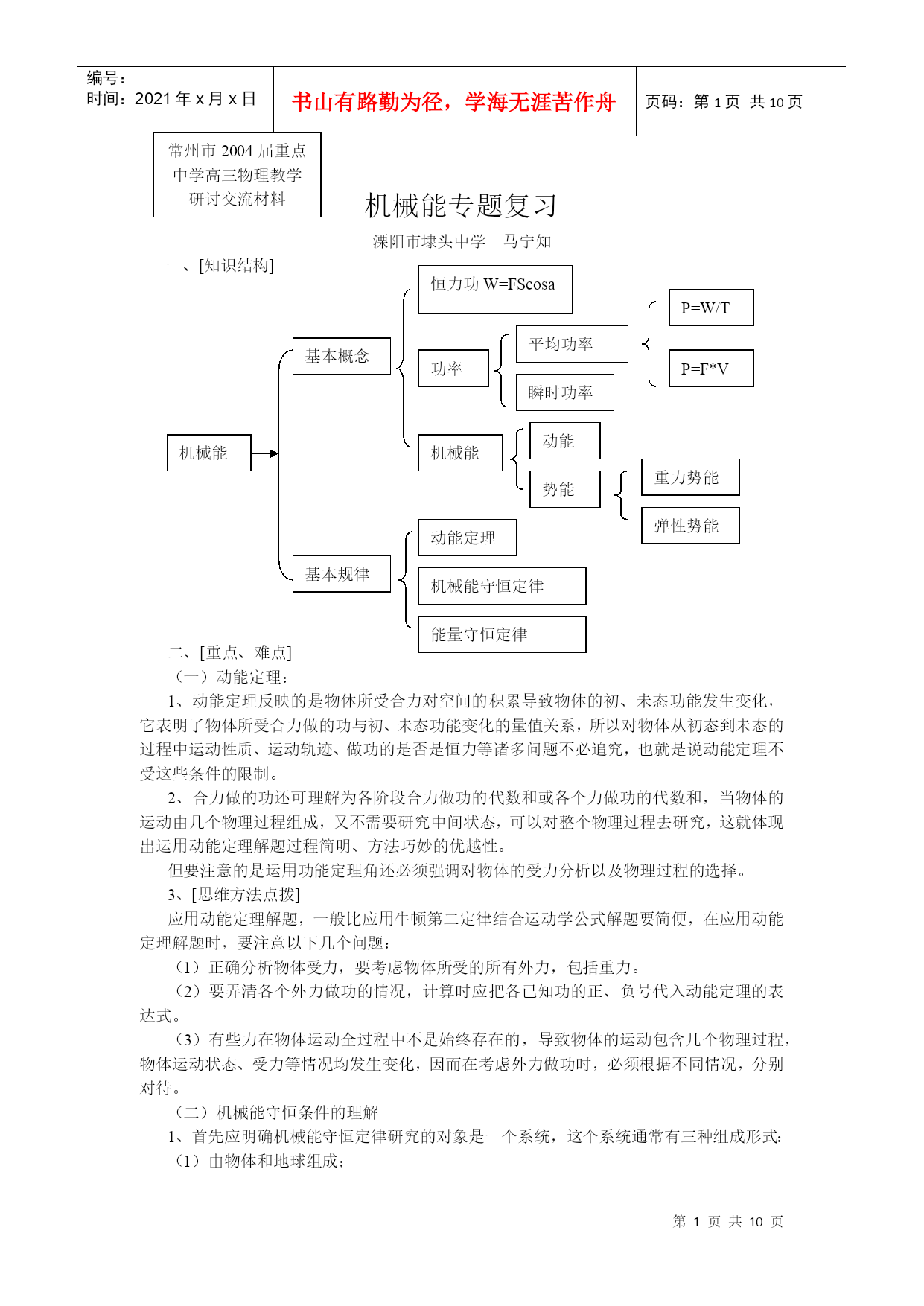 编号:时间:2021年x月x日书山有路勤为径,学海无涯苦作舟页码:第PAGE10页共NUMPAGES10页第PAGE\*MERGEFORMAT10页共NUMPAGES\*MERGEFORMAT10页常州市2004届重点中学高三物理教学研讨交流材料机械能专题复习溧阳市埭头中学马宁知恒力功W=FScosa一、[知识结构]P=W/T平均功率基本概念功率P=F*V瞬时功率动能机械能机械能重力势能势能弹性势能动能定理基本规律机械能守恒定律能量守恒定律二、[重点、难点](一)动能定理:1、动能