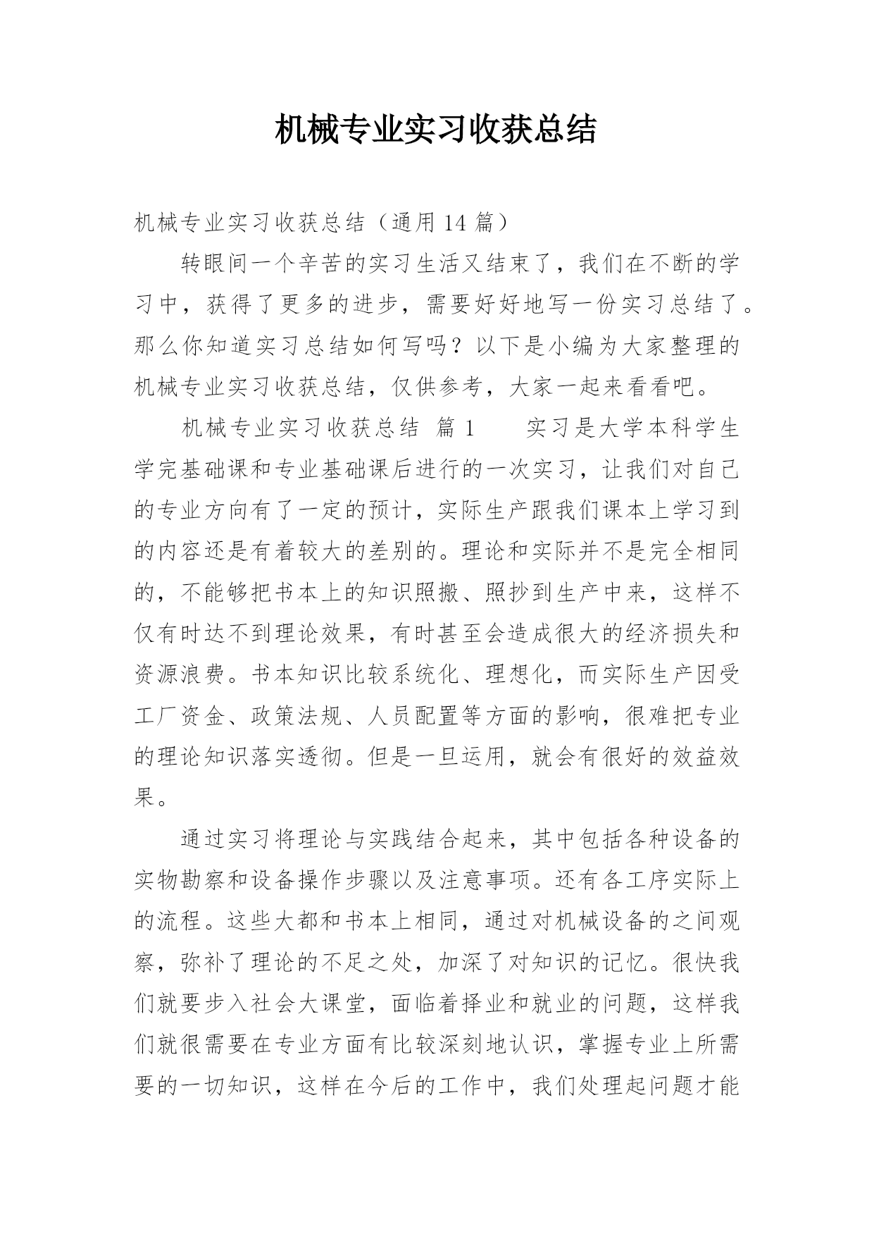 机械专业实习收获总结机械专业实习收获总结(通用14篇)转眼间一个辛苦的实习生活又结束了,我们在不断的学习中,获得了更多的进步,需要好好地写一份实习总结了。那么你知道实习总结如何写吗?以下是小编为大家整理的机械专业实习收获总结,仅供参考,大家一起来看看吧。机械专业实习收获总结篇1实习是大学本科学生学完基础课和专业基础课后进行的一次实习,让我们对自己的专业方向有了一定的预计,实际生产跟我们课本上学习到的内容还是有着较大的差别的。理论和实际并不是完全相同的,不能够把书本上的知识照搬、照抄到生产中来,这样不仅有时