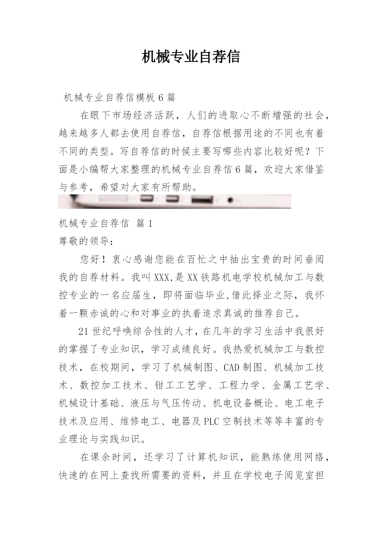 机械专业自荐信机械专业自荐信模板6篇在眼下市场经济活跃,人们的进取心不断增强的社会,越来越多人都去使用自荐信,自荐信根据用途的不同也有着不同的类型。写自荐信的时候主要写哪些内容比较好呢?下面是小编帮大家整理的机械专业自荐信6篇,欢迎大家借鉴与参考,希望对大家有所帮助。机械专业自荐信篇1尊敬的领导:您好!衷心感谢您能在百忙之中抽出宝贵的时间垂阅我的自荐材料。我叫XXX,是XX铁路机电学校机械加工与数控专业的一名应届生,即将面临毕业,借此择业之际,我怀着一颗赤诚的心和对事业的执着追求真诚的推荐自己。21世纪呼