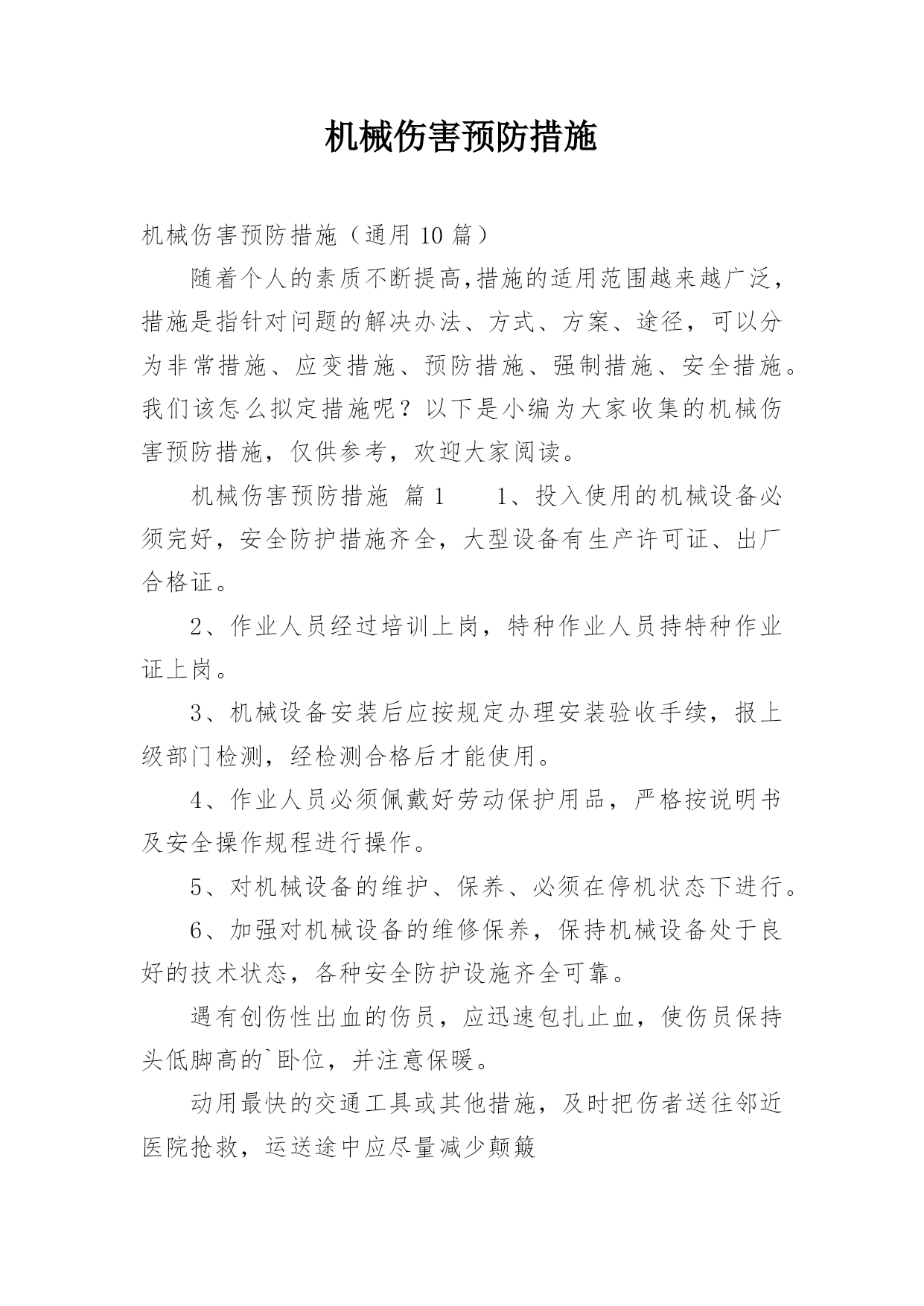 机械伤害预防措施机械伤害预防措施(通用10篇)随着个人的素质不断提高,措施的适用范围越来越广泛,措施是指针对问题的解决办法、方式、方案、途径,可以分为非常措施、应变措施、预防措施、强制措施、安全措施。我们该怎么拟定措施呢?以下是小编为大家收集的机械伤害预防措施,仅供参考,欢迎大家阅读。机械伤害预防措施篇11、投入使用的机械设备必须完好,安全防护措施齐全,大型设备有生产许可证、出厂合格证。2、作业人员经过培训上岗,特种作业人员持特种作业证上岗。3、机械设备安装后应按规定办理安装验收手续,报上级部门检测,经检