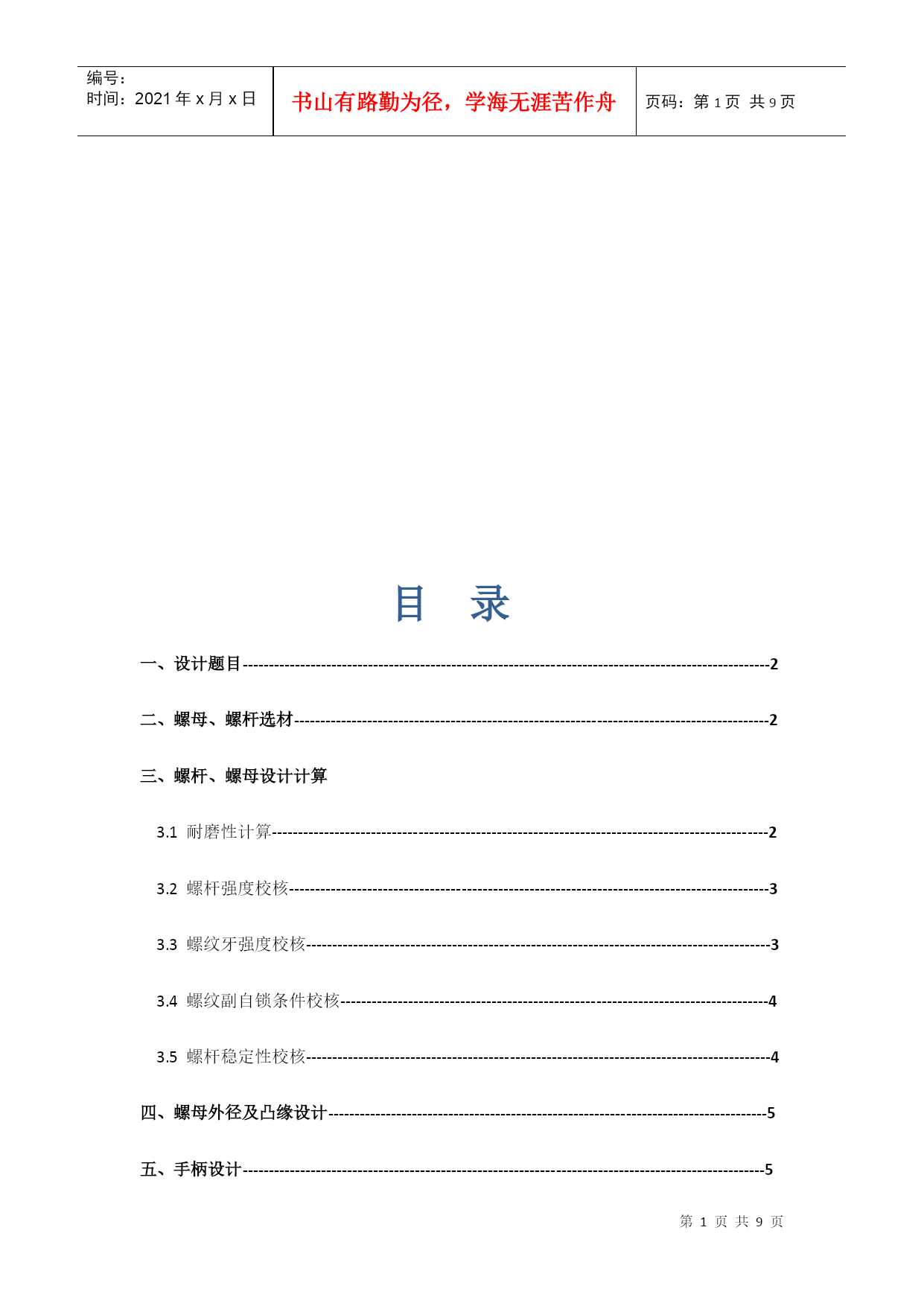 编号:时间:2021年x月x日书山有路勤为径,学海无涯苦作舟页码:第PAGE9页共NUMPAGES9页第PAGE\*MERGEFORMAT9页共NUMPAGES\*MERGEFORMAT9页HYPERLINK""目录一、设计题目-----------------------------------------------------------------------------------------------------2二、螺母、螺杆选材---------------