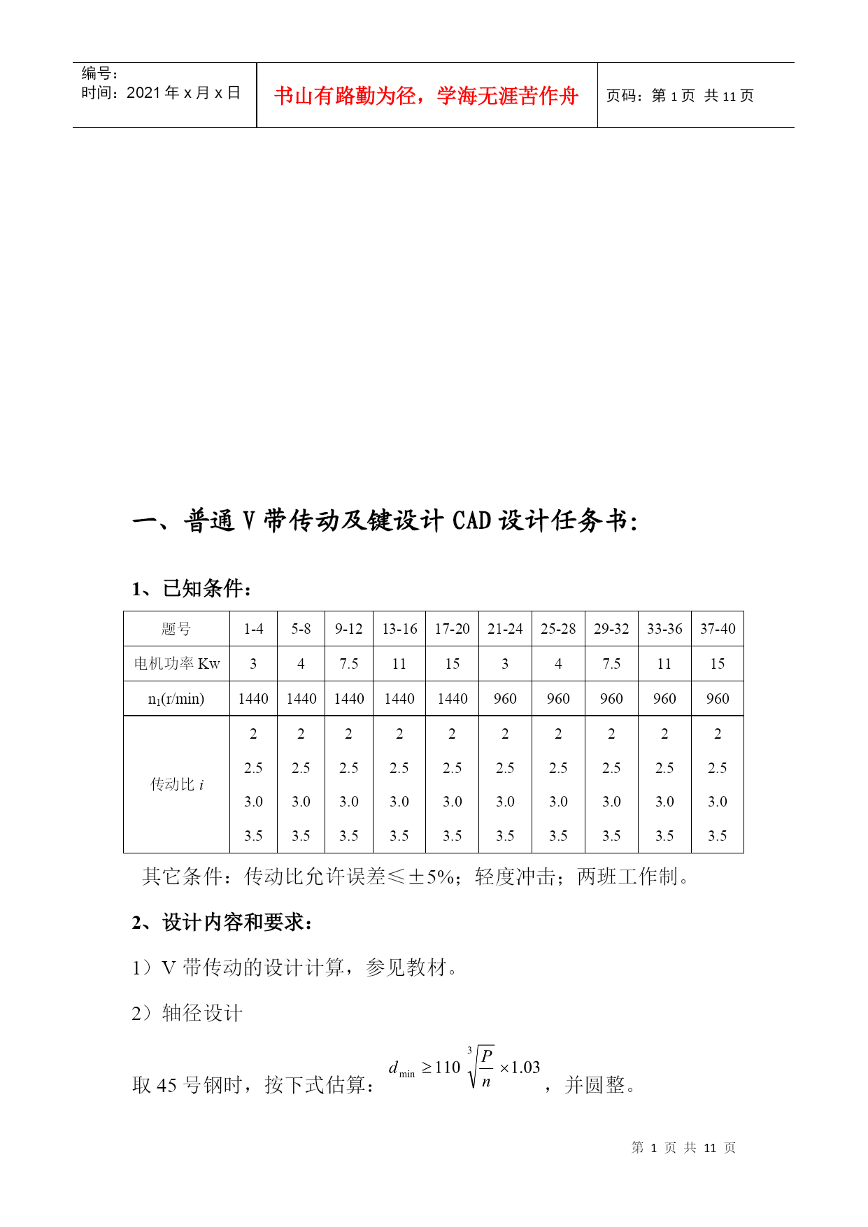 编号:时间:2021年x月x日书山有路勤为径,学海无涯苦作舟页码:第PAGE11页共NUMPAGES11页第PAGE\*MERGEFORMAT11页共NUMPAGES\*MERGEFORMAT11页HYPERLINK""一、普通V带传动及键设计CAD设计任务书:1、已知条件:题号1-45-89-1213-1617-2021-2425-2829-3233-3637-40电机功率Kw347.51115347.51115n1(r/min)1440144014401440144096