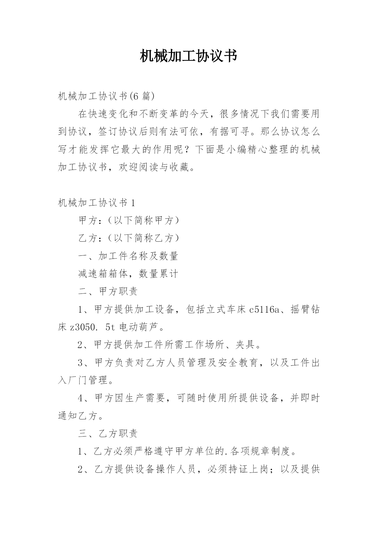 机械加工协议书机械加工协议书(6篇)在快速变化和不断变革的今天,很多情况下我们需要用到协议,签订协议后则有法可依,有据可寻。那么协议怎么写才能发挥它最大的作用呢?下面是小编精心整理的机械加工协议书,欢迎阅读与收藏。机械加工协议书1甲方:(以下简称甲方)乙方:(以下简称乙方)一、加工件名称及数量减速箱箱体,数量累计二、甲方职责1、甲方提供加工设备,包括立式车床c5116a、摇臂钻床z3050.5t电动葫芦。2、甲方提供加工件所需工作场所、夹具。3、甲方负责对乙方人员管理及安全教育,以及工件出入厂门管理。4、