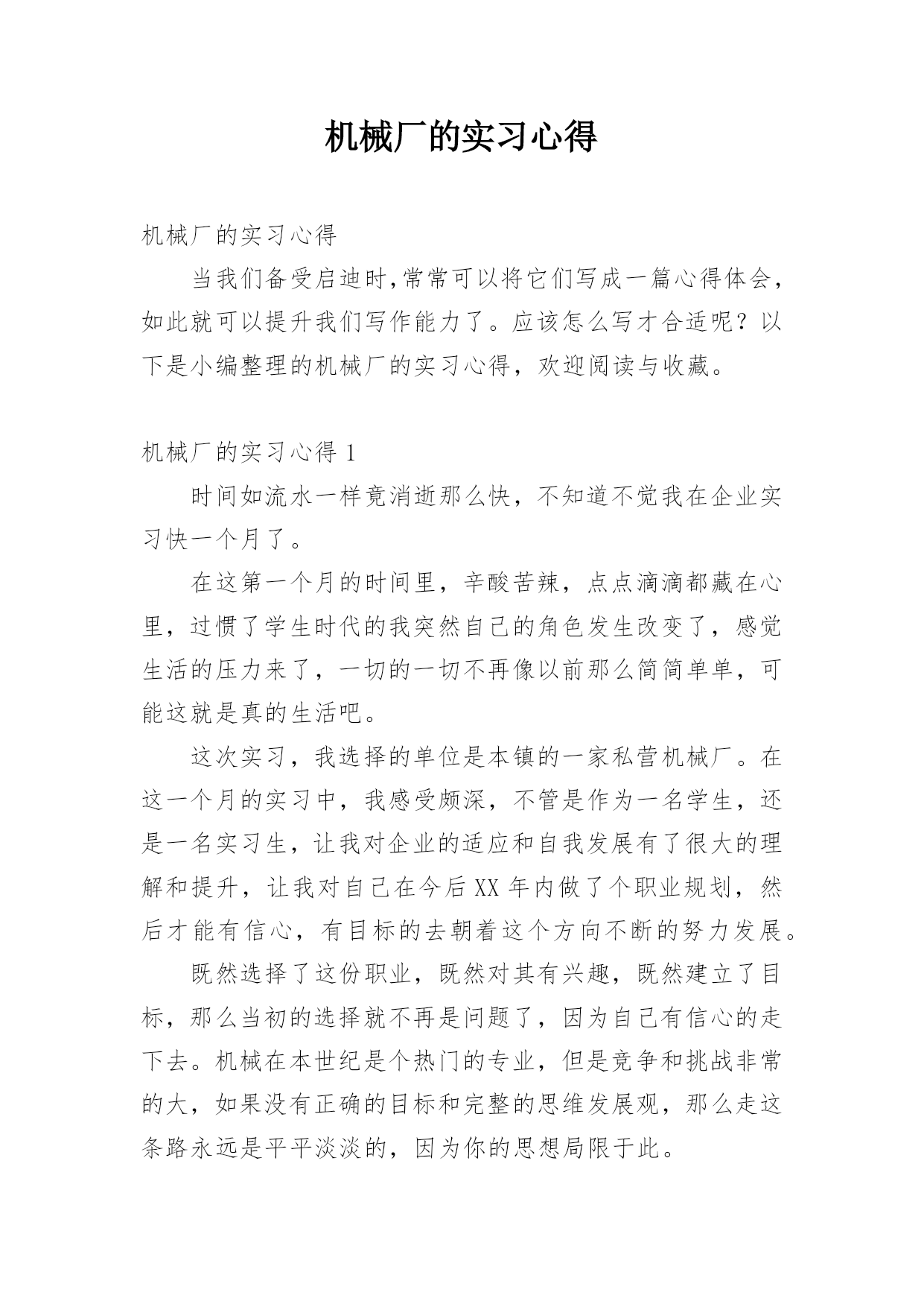 机械厂的实习心得机械厂的实习心得当我们备受启迪时,常常可以将它们写成一篇心得体会,如此就可以提升我们写作能力了。应该怎么写才合适呢?以下是小编整理的机械厂的实习心得,欢迎阅读与收藏。机械厂的实习心得1时间如流水一样竟消逝那么快,不知道不觉我在企业实习快一个月了。在这第一个月的时间里,辛酸苦辣,点点滴滴都藏在心里,过惯了学生时代的我突然自己的角色发生改变了,感觉生活的压力来了,一切的一切不再像以前那么简简单单,可能这就是真的生活吧。这次实习,我选择的单位是本镇的一家私营机械厂。在这一个月的实习中,我感受颇深