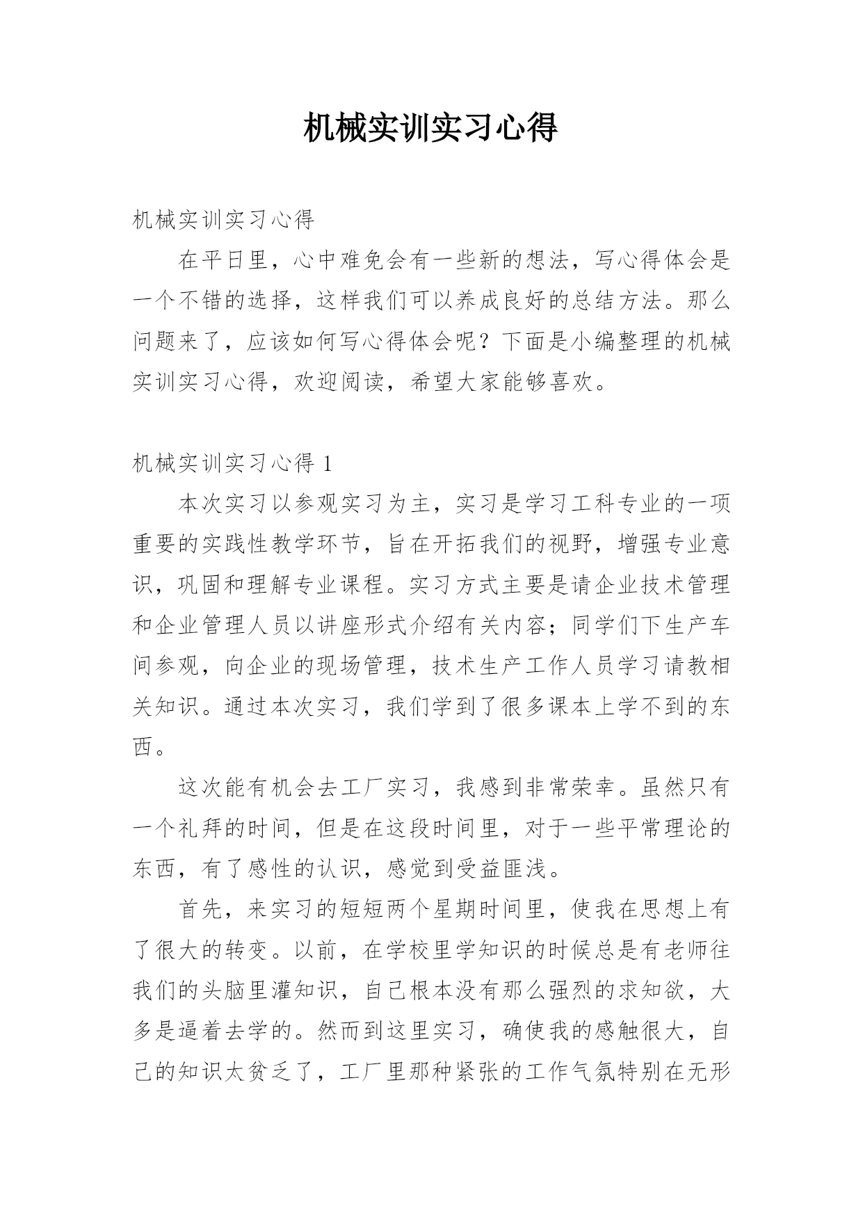 机械实训实习心得机械实训实习心得在平日里,心中难免会有一些新的想法,写心得体会是一个不错的选择,这样我们可以养成良好的总结方法。那么问题来了,应该如何写心得体会呢?下面是小编整理的机械实训实习心得,欢迎阅读,希望大家能够喜欢。机械实训实习心得1本次实习以参观实习为主,实习是学习工科专业的一项重要的实践性教学环节,旨在开拓我们的视野,增强专业意识,巩固和理解专业课程。实习方式主要是请企业技术管理和企业管理人员以讲座形式介绍有关内容;同学们下生产车间参观,向企业的现场管理,技术生产工作人员学习请教相关知识。通