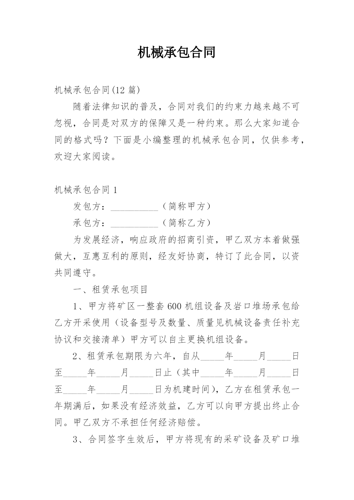 机械承包合同机械承包合同(12篇)随着法律知识的普及,合同对我们的约束力越来越不可忽视,合同是对双方的保障又是一种约束。那么大家知道合同的格式吗?下面是小编整理的机械承包合同,仅供参考,欢迎大家阅读。机械承包合同1发包方:__________(简称甲方)承包方:__________(简称乙方)为发展经济,响应政府的招商引资,甲乙双方本着做强做大,互惠互利的原则,经友好协商,特订了此合同,以资共同遵守。一、租赁承包项目1、甲方将矿区一整套600机组设备及岩口堆场承包给乙方开采使用(设备型号及数量、质量见机械