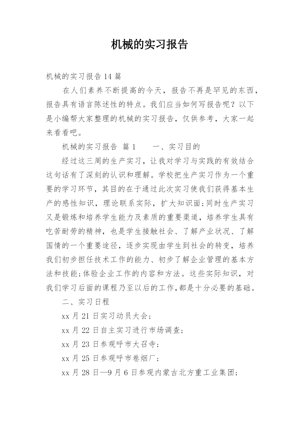 机械的实习报告机械的实习报告14篇在人们素养不断提高的今天,报告不再是罕见的东西,报告具有语言陈述性的特点。我们应当如何写报告呢?以下是小编帮大家整理的机械的实习报告,仅供参考,大家一起来看看吧。机械的实习报告篇1一、实习目的经过这三周的生产实习,让我对学习与实践的有效结合这句话有了深刻的认识和理解。学校把生产实习作为一个重要的学习环节,其目的在于通过此次实习使我们获得基本生产的感性知识,理论联系实际,扩大知识面;同时生产实习又是锻炼和培养学生能力及素质的重要渠道,培养学生具有吃苦耐劳的精神,也是学生接触