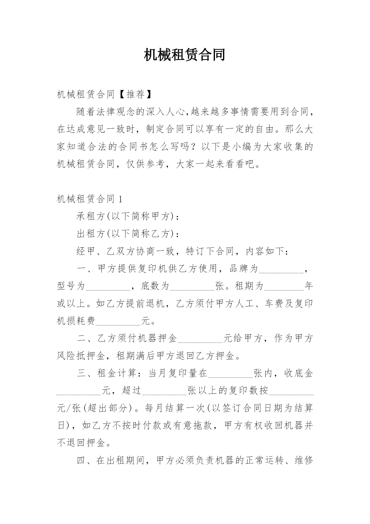 机械租赁合同机械租赁合同【推荐】随着法律观念的深入人心,越来越多事情需要用到合同,在达成意见一致时,制定合同可以享有一定的自由。那么大家知道合法的合同书怎么写吗?以下是小编为大家收集的机械租赁合同,仅供参考,大家一起来看看吧。机械租赁合同1承租方(以下简称甲方):出租方(以下简称乙方):经甲、乙双方协商一致,特订下合同,内容如下:一、甲方提供复印机供乙方使用,品牌为_________,型号为_________,底数为_________张。租期为________年或以上。如乙方提前退机,乙方须付甲方人工、车
