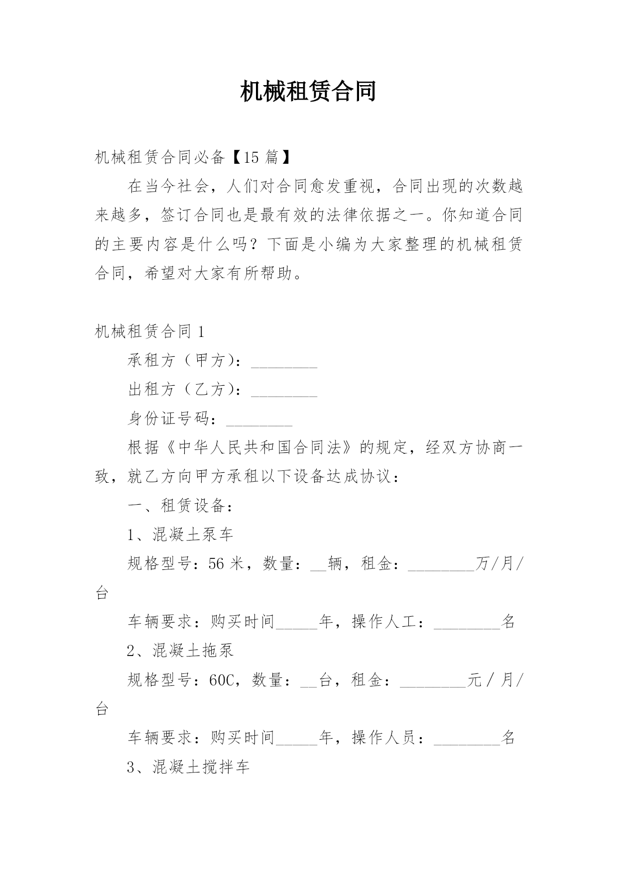 机械租赁合同机械租赁合同必备【15篇】在当今社会,人们对合同愈发重视,合同出现的次数越来越多,签订合同也是最有效的法律依据之一。你知道合同的主要内容是什么吗?下面是小编为大家整理的机械租赁合同,希望对大家有所帮助。机械租赁合同1承租方(甲方):________出租方(乙方):________身份证号码:________根据《中华人民共和国合同法》的规定,经双方协商一致,就乙方向甲方承租以下设备达成协议:一、租赁设备:1、混凝土泵车规格型号:56米,数量:__辆,租金:________万/月/台车辆要求:购