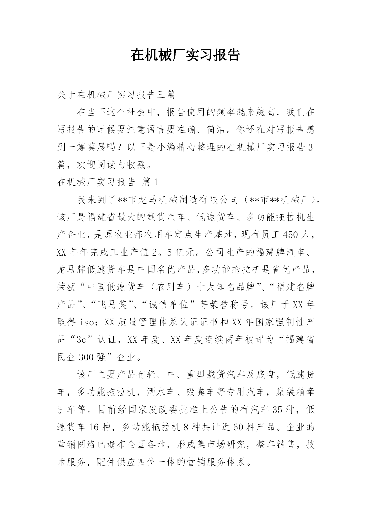 在机械厂实习报告关于在机械厂实习报告三篇在当下这个社会中,报告使用的频率越来越高,我们在写报告的时候要注意语言要准确、简洁。你还在对写报告感到一筹莫展吗?以下是小编精心整理的在机械厂实习报告3篇,欢迎阅读与收藏。在机械厂实习报告篇1我来到了**市龙马机械制造有限公司(**市**机械厂)。该厂是福建省最大的载货汽车、低速货车、多功能拖拉机生产企业,是原农业部农用车定点生产基地,现有员工450人,XX年年完成工业产值2。5亿元。公司生产的福建牌汽车、龙马牌低速货车是中国名优产品,多功能拖拉机是省优产品,荣获“