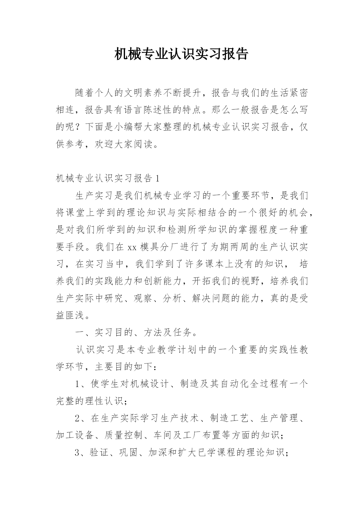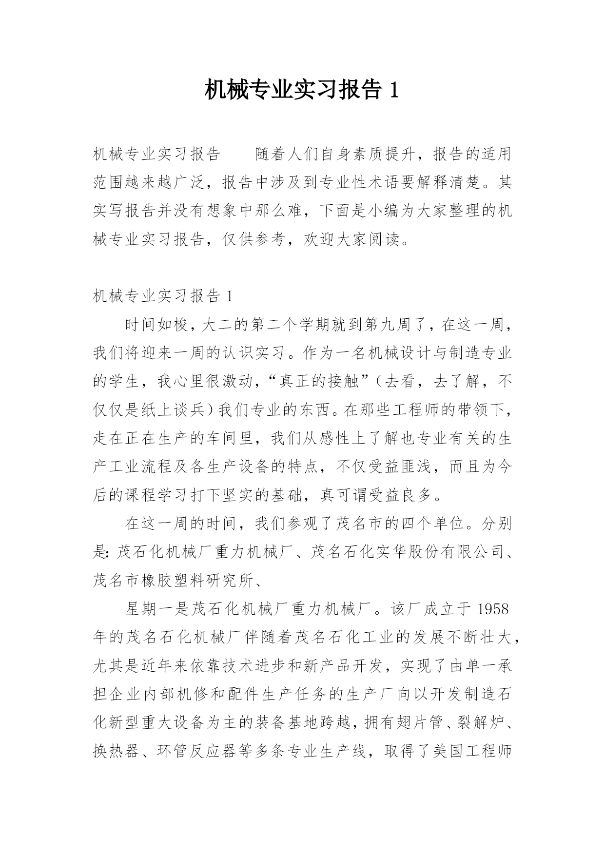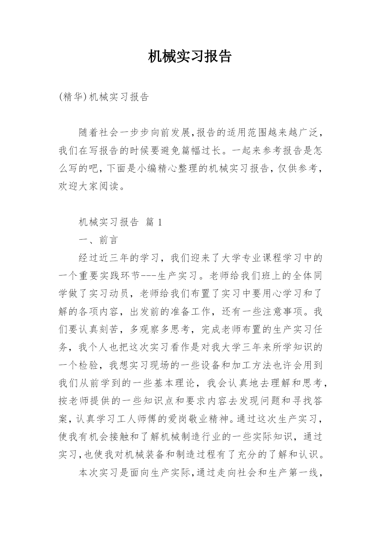 机械专业实习报告1机械专业实习报告随着人们自身素质提升,报告的适用范围越来越广泛,报告中涉及到专业性术语要解释清楚。其实写报告并没有想象中那么难,下面是小编为大家整理的机械专业实习报告,仅供参考,欢迎大家阅读。机械专业实习报告1时间如梭,大二的第二个学期就到第九周了,在这一周,我们将迎来一周的认识实习。作为一名机械设计与制造专业的学生,我心里很激动,“真正的接触”(去看,去了解,不仅仅是纸上谈兵)我们专业的东西。在那些工程师的带领下,走在正在生产的车间里,我们从感性上了解也专业有关的生产工业流程及各生产设